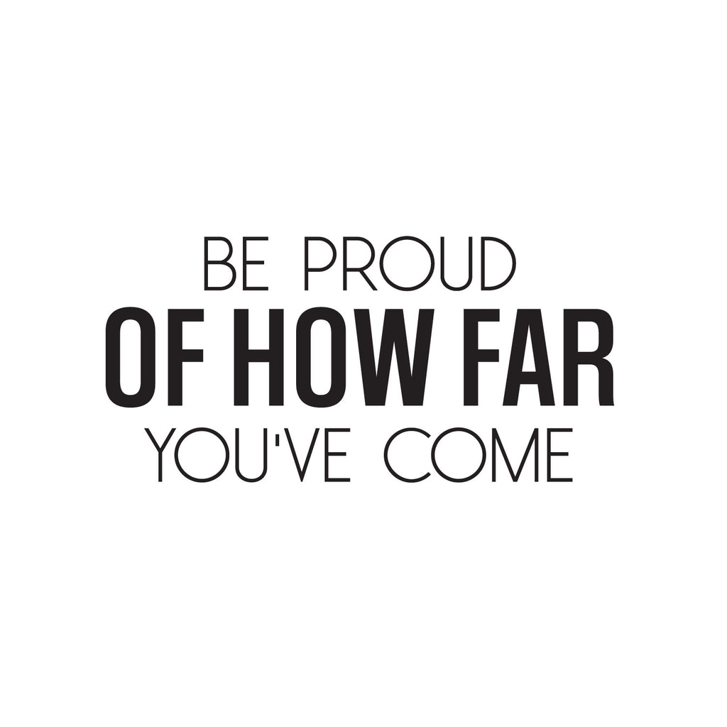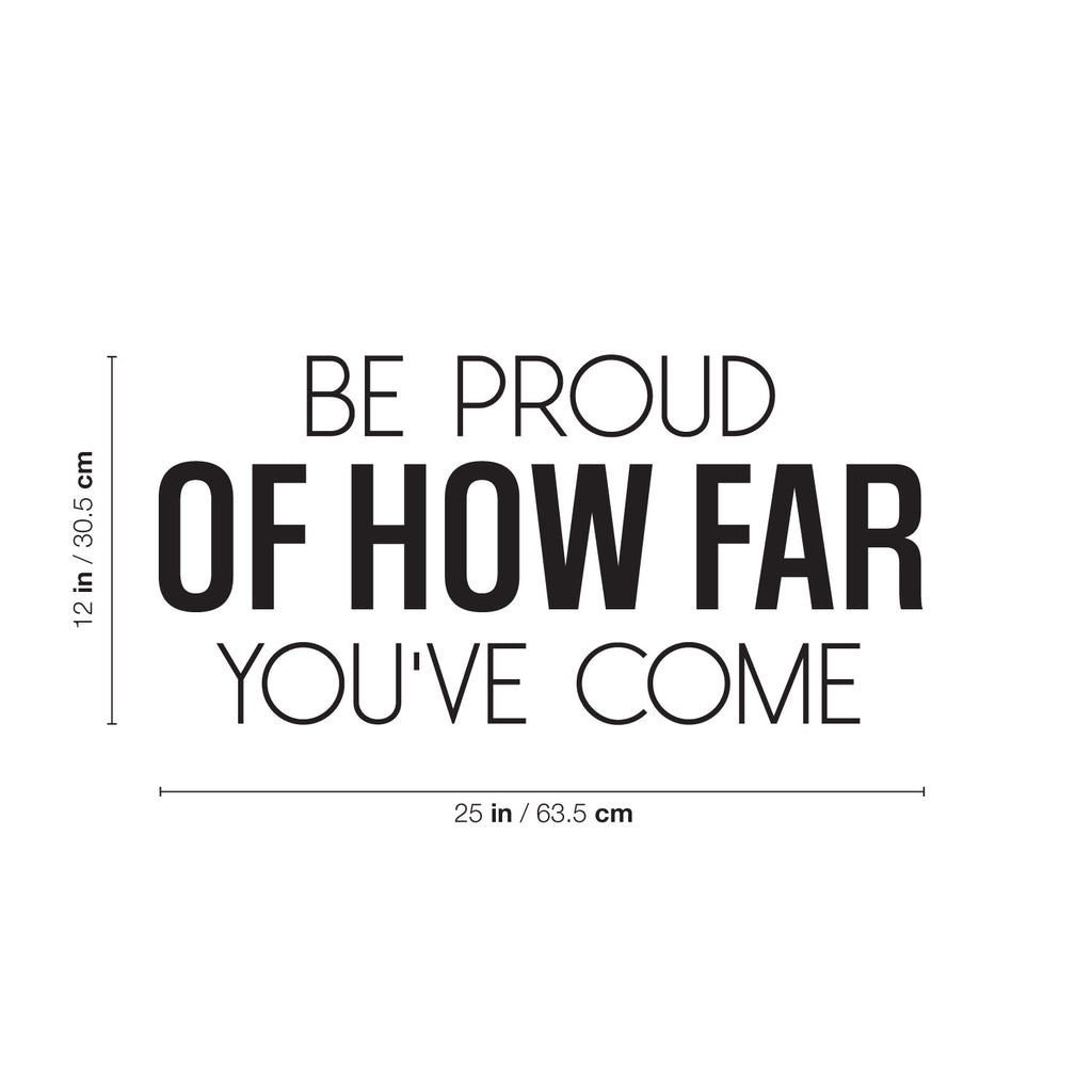 This awesome motivational & positive decal quote "Be Proud Of How Far You've Come"; is the perfect touch for your home or office. Use it for your bedroom; living room; classroom or anywhere you want to bring some extra positive decoration. It's a vinyl sticker that is easy to put on any smooth and dry surface. Our modern designs don't just brighten up the room; but brighten up the day. Using top of the line vinyl across all of our production allows us to be the leaders in quality and design.