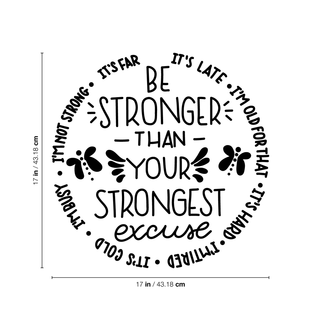This motivational "Be Stronger Than Your Strongest Excuse" wall decal quote is modern and the perfect touch for your home or workplace. Use it for your bedroom; living room; or any other room in your house where you want to bring some extra decoration. It's a vinyl sticker that is easy to put on almost any smooth and dry surface. Our designs don't just brighten up the room; but brighten up your day. Using top of the line vinyl across all of our production allows us to be the leaders in quality and design.
