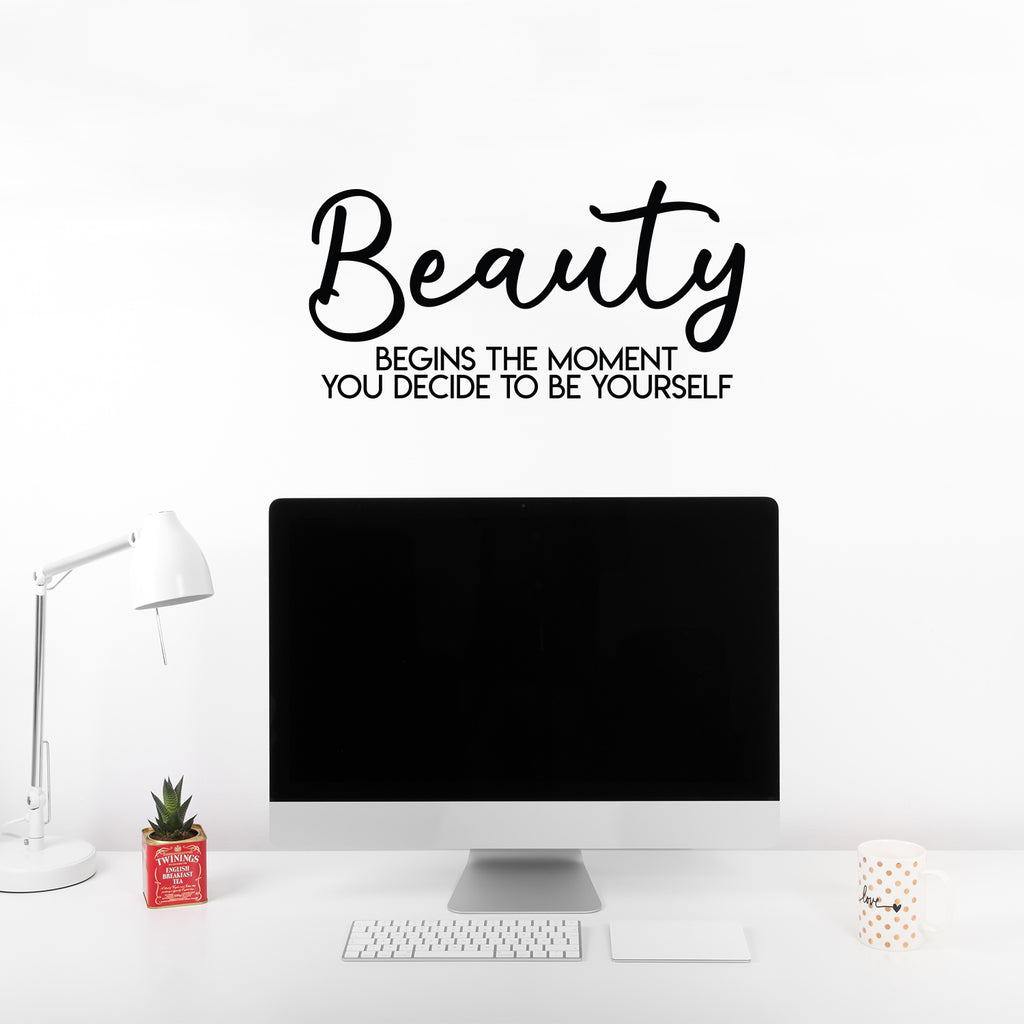 This awesome optimistic decal quote "Beauty Begins The Moment You Decide To Be Yourself"; is the perfect touch for your home or work. Use it for your bedroom; closet; living room or anywhere you want to bring some extra positive decoration. It's a vinyl sticker that is easy to put on any smooth and dry surface. Our modern designs don't just brighten up the room; but brighten up the day. Using top of the line vinyl across all of our production allows us to be the leaders in quality and design.