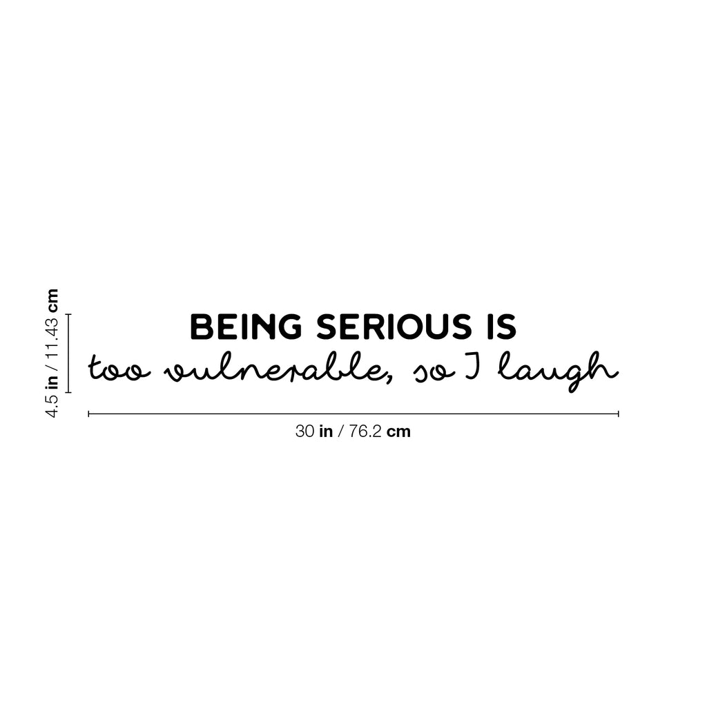 This optimistic decal quote "Being Serious Is Too Vulnerable So I Laugh"; is the perfect touch for your home or office. Use it for your living room; playroom; kids room or anywhere you want to bring some extra cute decoration. It's a vinyl sticker that is easy to put on any smooth and dry surface. Our modern designs don't just brighten up the room; but brighten up the day. Using top of the line vinyl across all of our production allows us to be the leaders in quality and design.