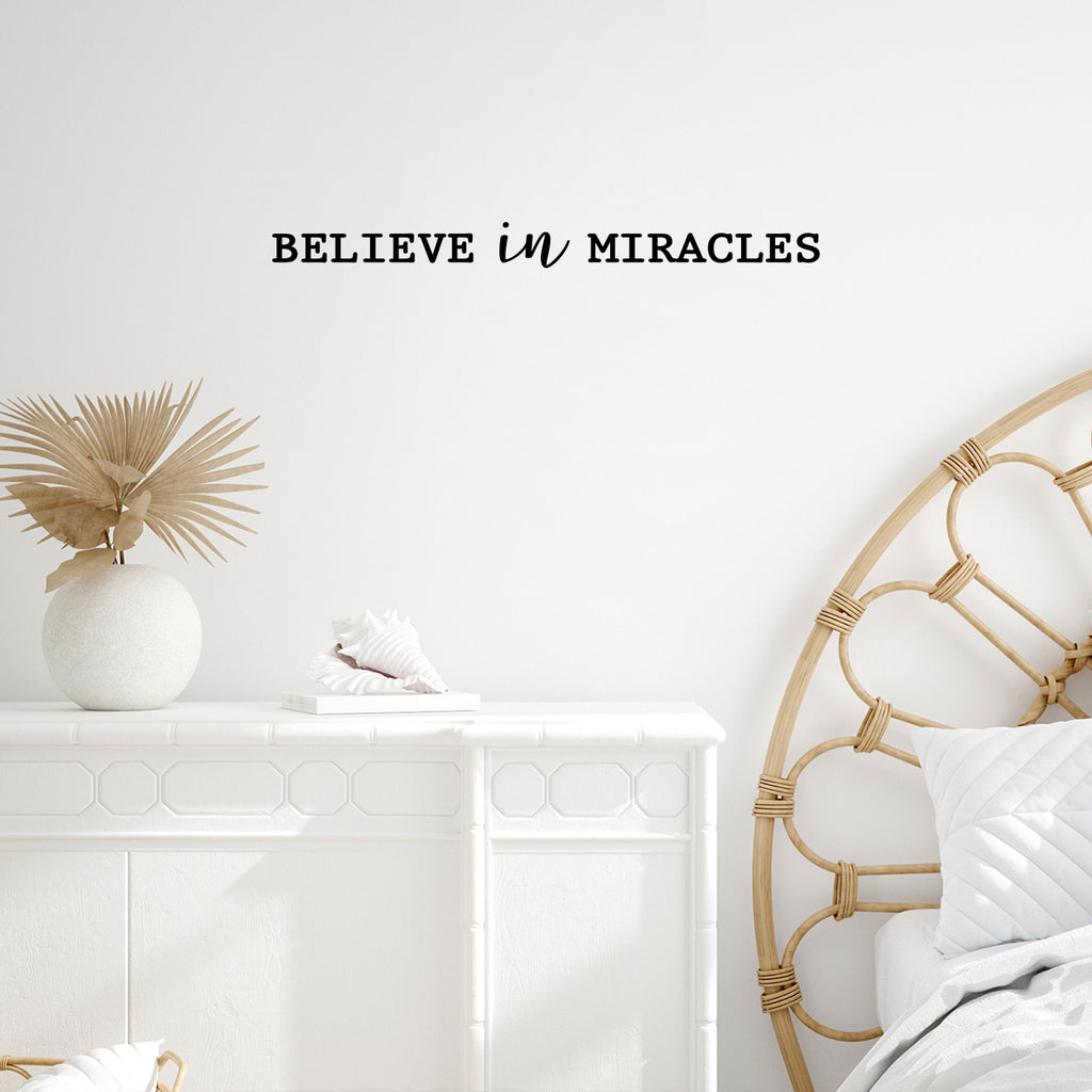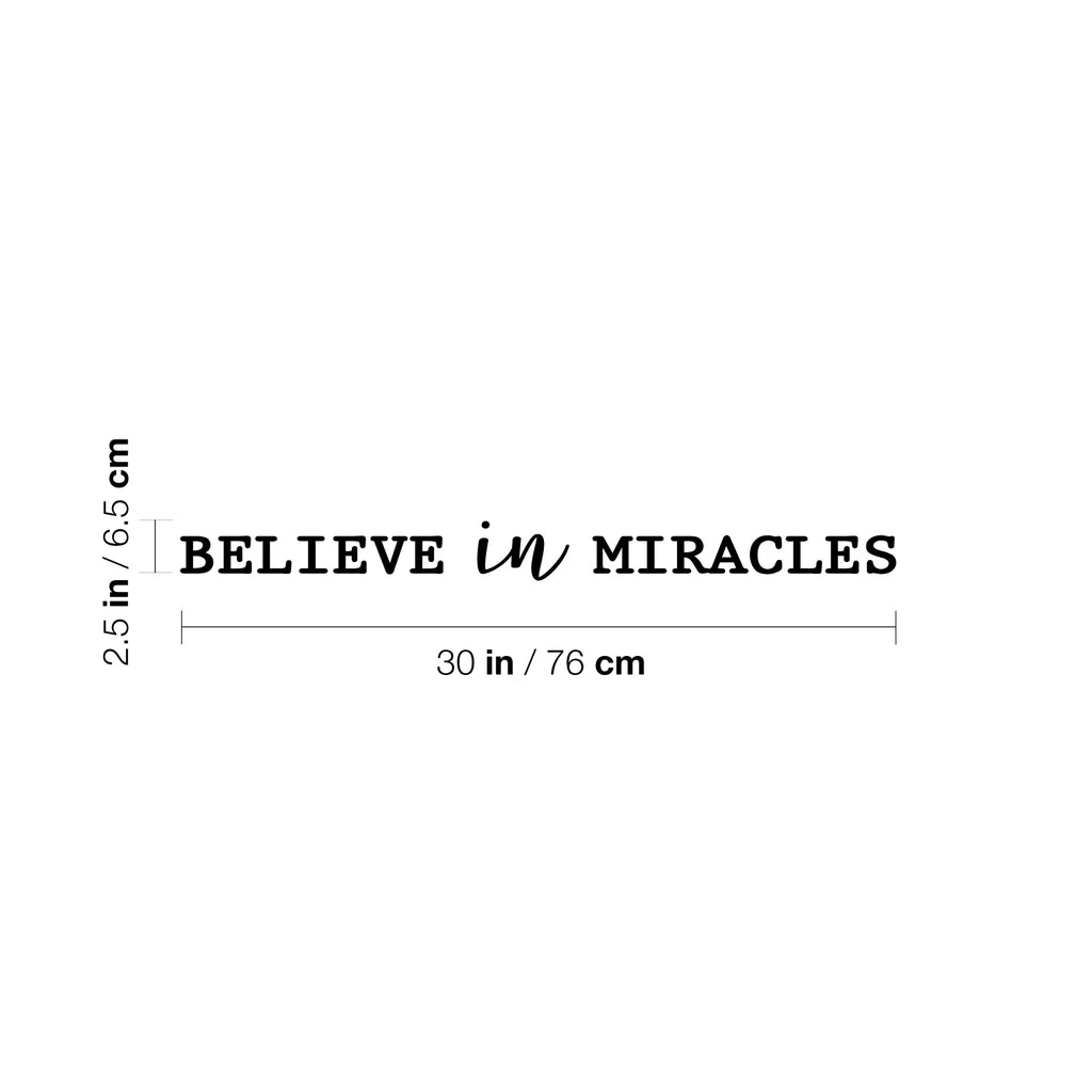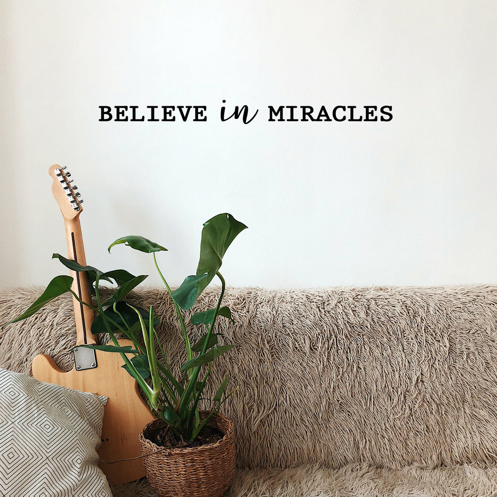 This great decal quote "Believe In Miracles"; is the perfect touch for your home. Use it for your kids room; living room or anywhere you want to bring some extra decoration. It's a vinyl sticker that is easy to put on any smooth and dry surface. Our modern designs don't just brighten up the room; but brighten up the day. Using top of the line vinyl across all of our production allows us to be the leaders in quality and design.