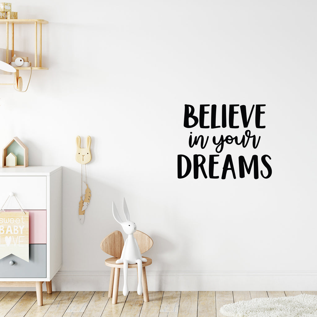 This awesome motivational decal quote "Believe In Your Dreams"; is the perfect touch for your home. Use it for your dorm room; home office; apartment or anywhere you want to bring some extra girly decoration. It's a vinyl sticker that is easy to put on any smooth and dry surface. Our modern designs don't just brighten up the room; but brighten up the day. Using top of the line vinyl across all of our production allows us to be the leaders in quality and design.