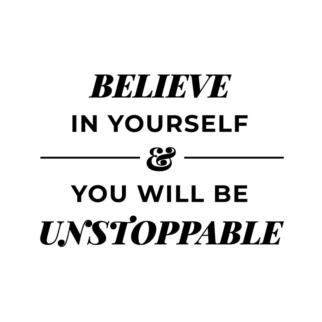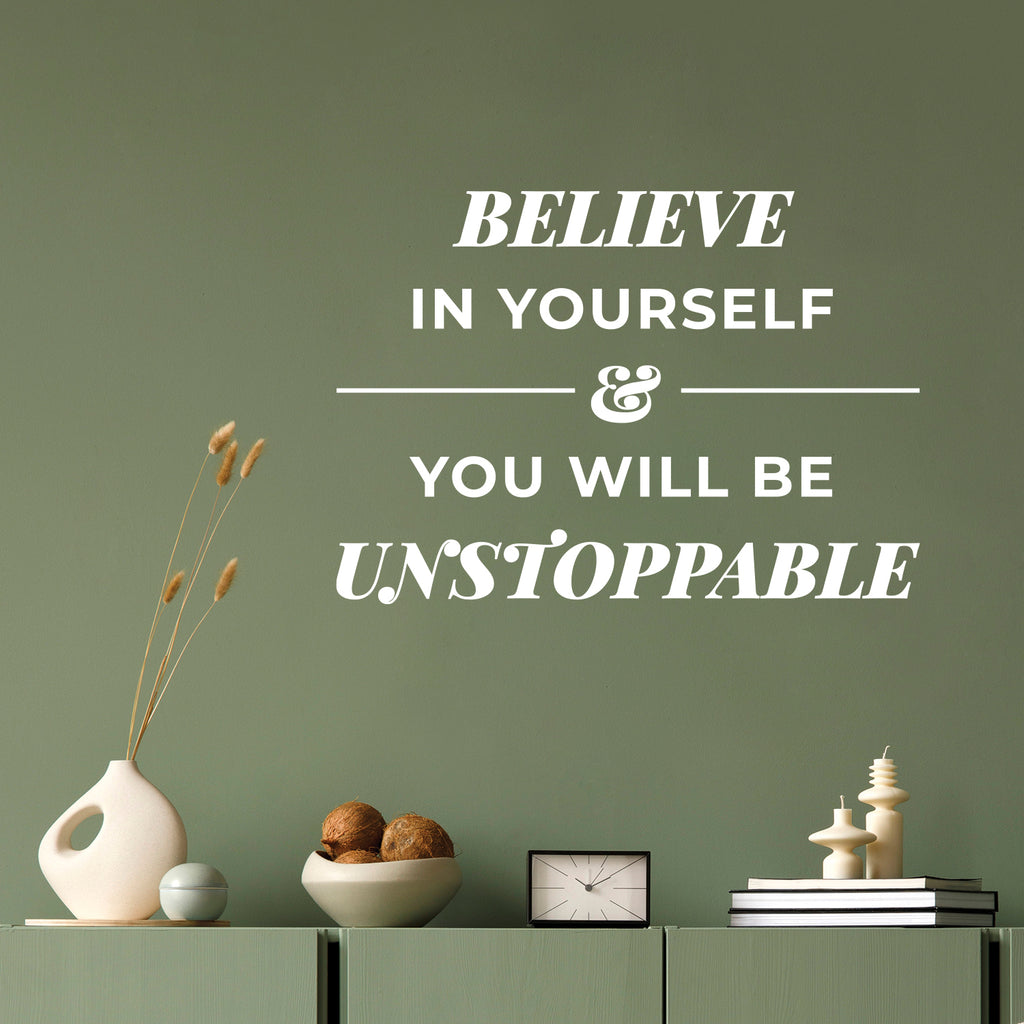 This awesome inspirational decal quote "Believe In Yourself & You Will Be Unstoppable"; is the perfect touch for your office. Use it for your bedroom; closet; living room or anywhere you want to bring some extra positive decoration. It's a vinyl sticker that is easy to put on any smooth and dry surface. Our modern designs don't just brighten up the room; but brighten up the day. Using top of the line vinyl across all of our production allows us to be the leaders in quality and design.
