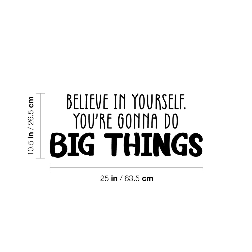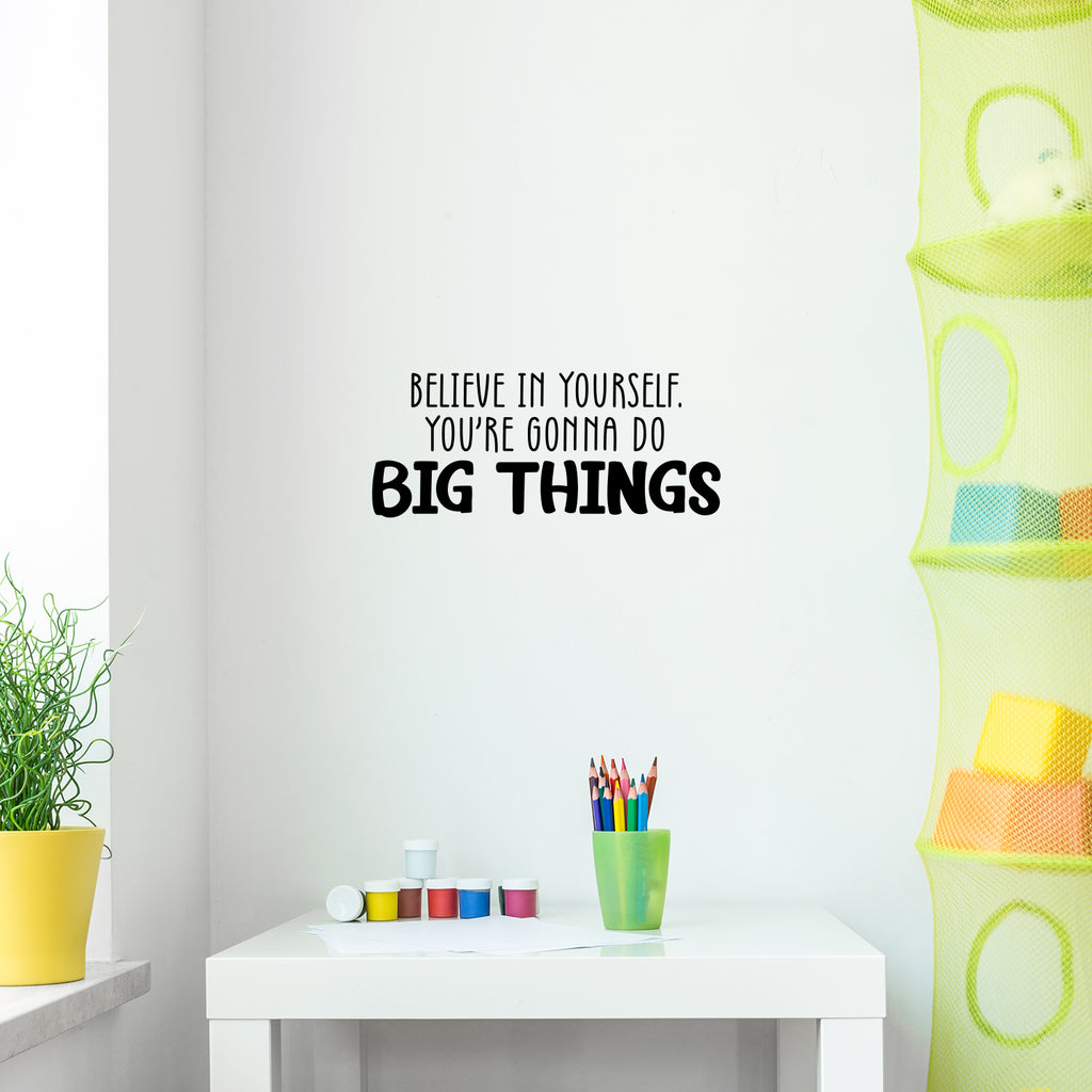 This great decal quote "Believe In Yourself You're Gonna Do Big Things"; is the perfect touch for your home. Use it for your makeup area; dorm room or anywhere you want to bring some extra decoration. It's a vinyl sticker that is easy to put on any smooth and dry surface. Our modern designs don't just brighten up the room; but brighten up the day. Using top of the line vinyl across all of our production allows us to be the leaders in quality and design.