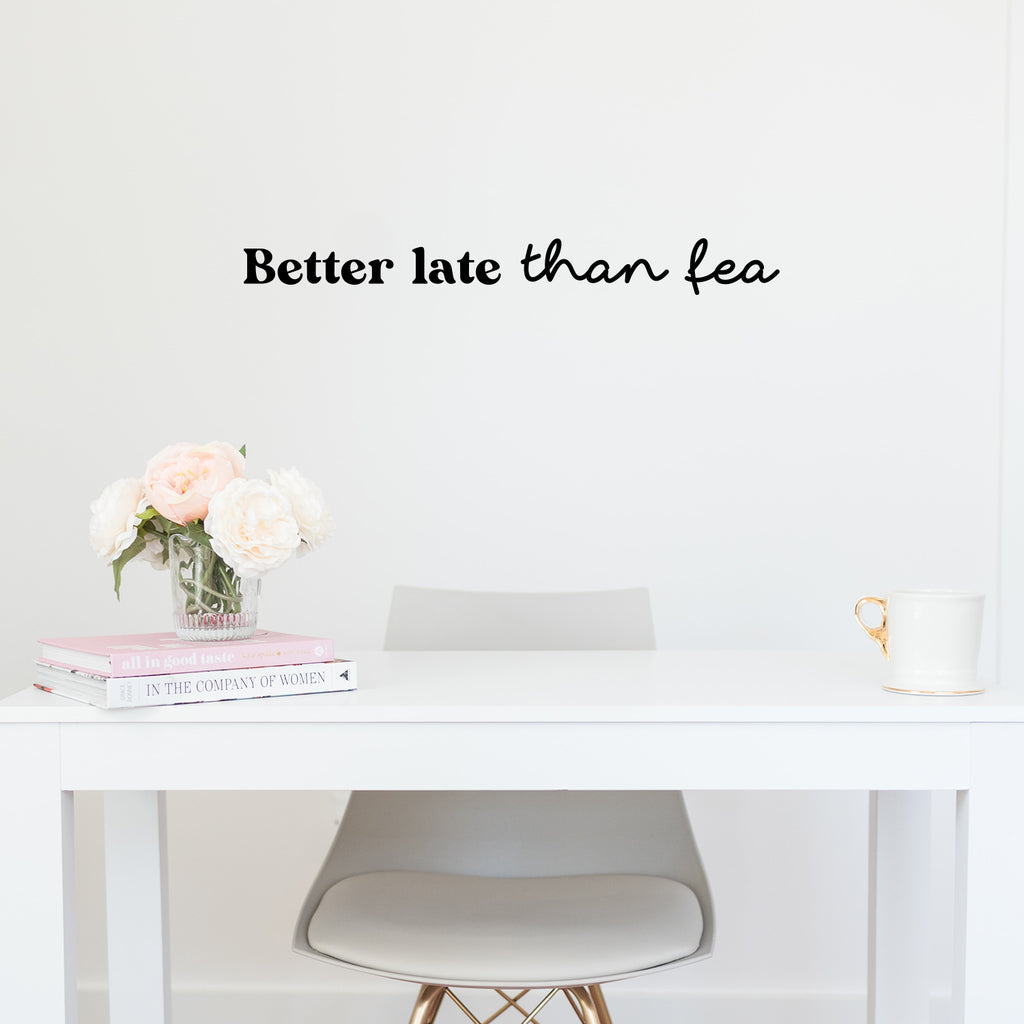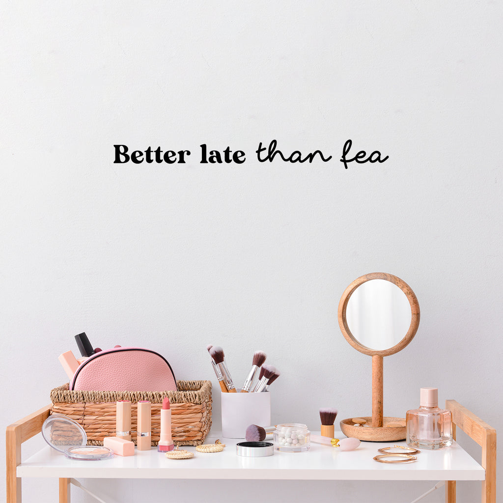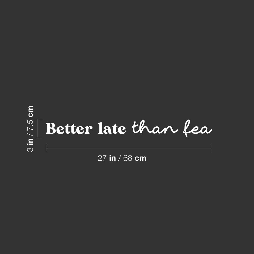 This cool funny & sarcastic decal quote "Better Late Than Fea"; is the perfect touch for your home or office. Use it for your business; coffee shop; bathroom or anywhere you want to bring some extra positive decoration. It's a vinyl sticker that is easy to put on any smooth and dry surface. Our modern designs don't just brighten up the room; but brighten up the day. Using top of the line vinyl across all of our production allows us to be the leaders in quality and design.