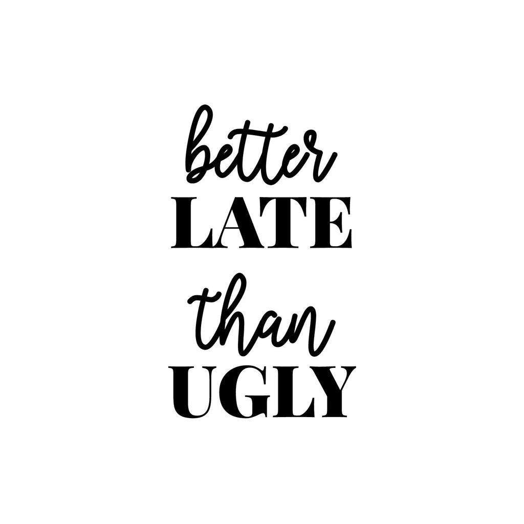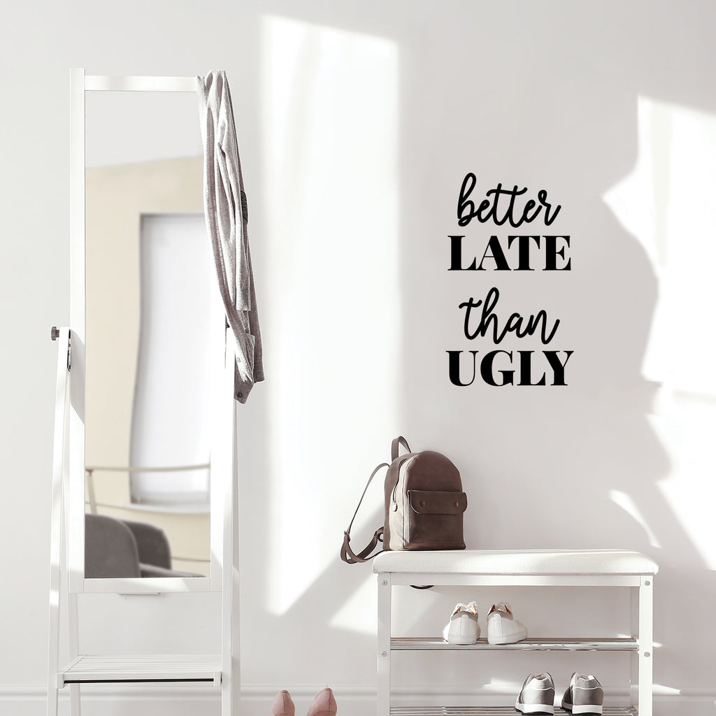 This awesome sarcastic decal quote "Better Late Than Ugly"; is the perfect touch for your home or apartment. Use it for your dorm room; home office or anywhere you want to bring some extra decoration. It's a vinyl sticker that is easy to put on any smooth and dry surface. Our modern designs don't just brighten up the room; but brighten up the day. Using top of the line vinyl across all of our production allows us to be the leaders in quality and design.