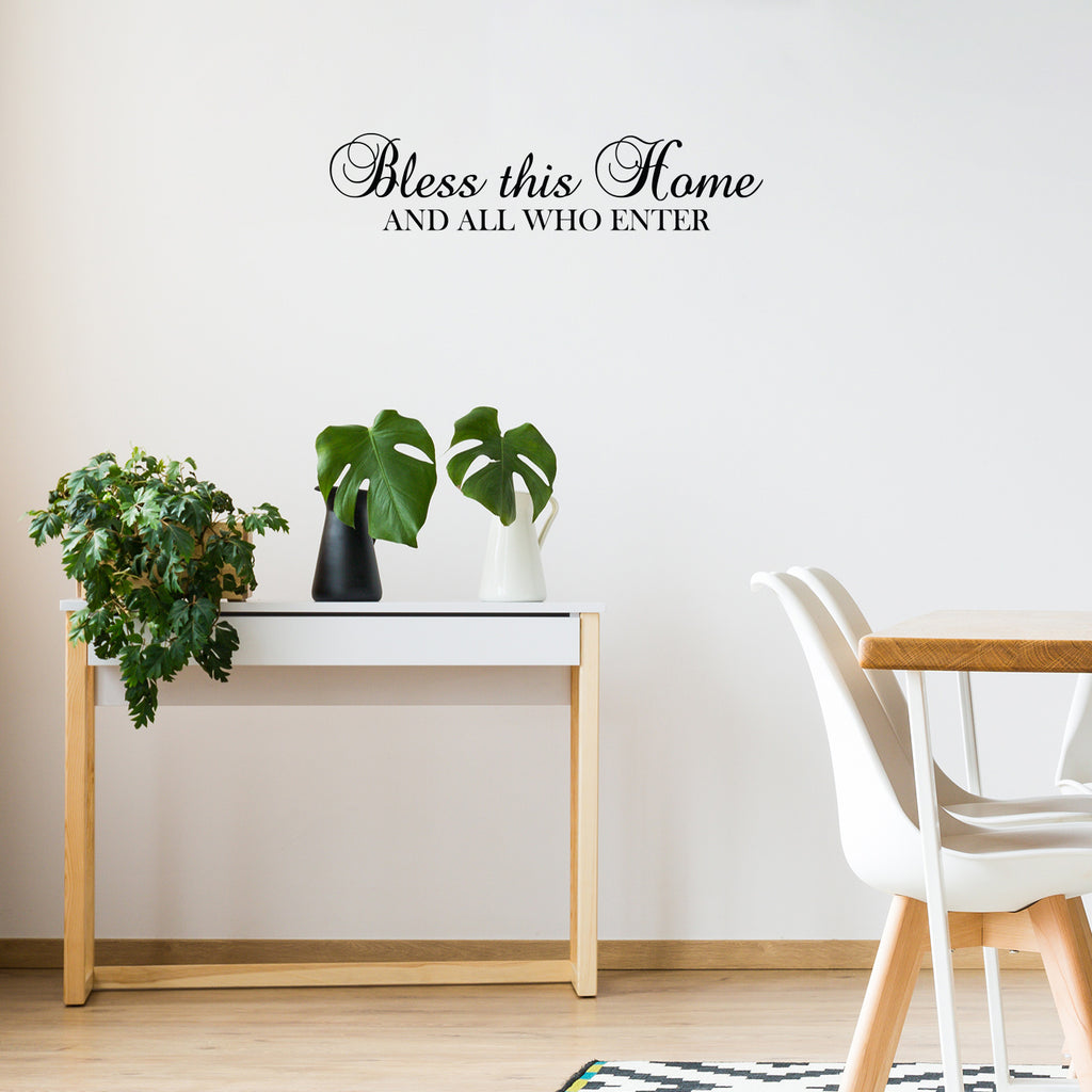 This cute decal quote "Bless This Home And All Who Enter"; is the perfect touch for your home or apartment. Use it for your living room; house or anywhere you want to bring some extra cute decoration. It's a vinyl sticker that is easy to put on any smooth and dry surface. Our modern designs don't just brighten up the room; but brighten up the day. Using top of the line vinyl across all of our production allows us to be the leaders in quality and design.