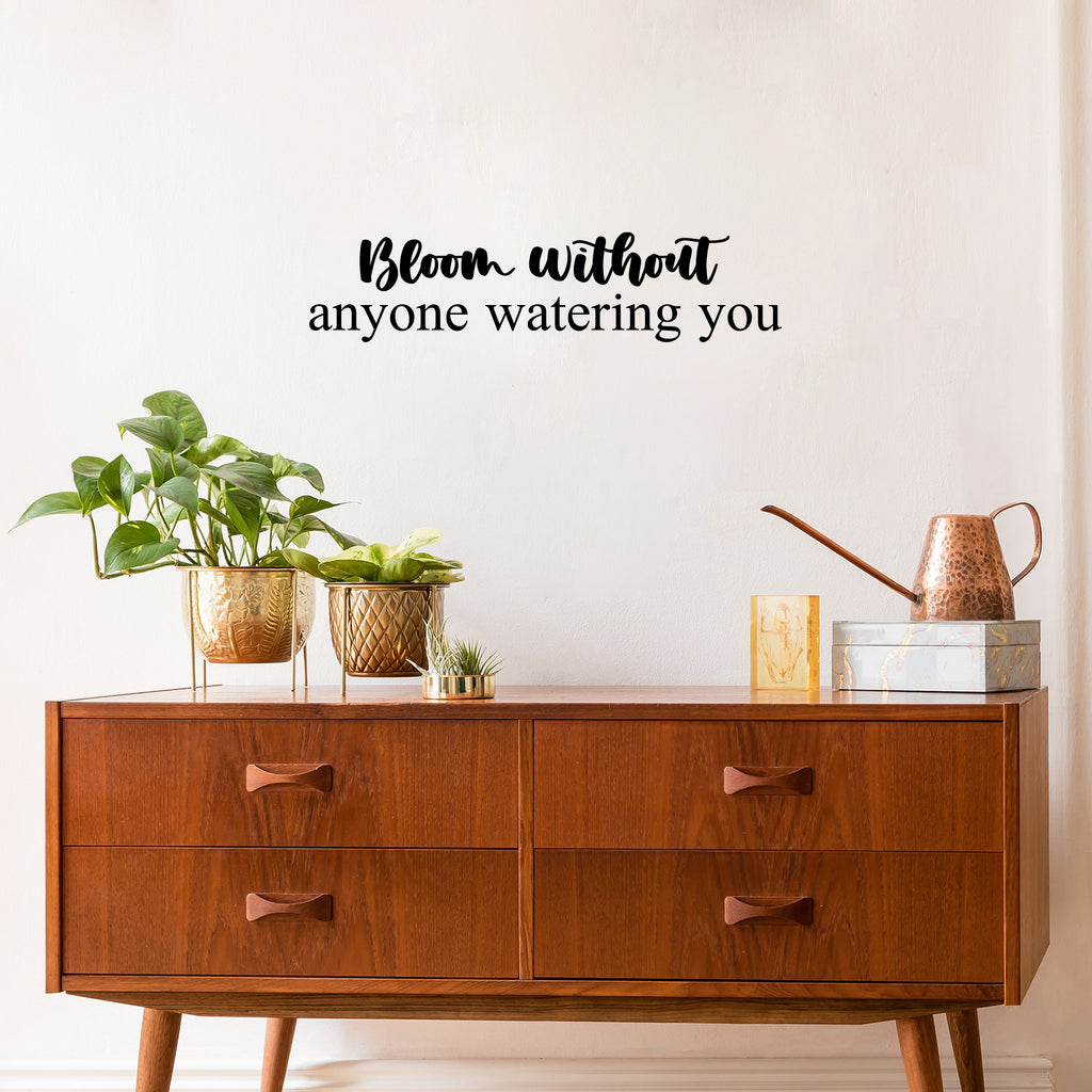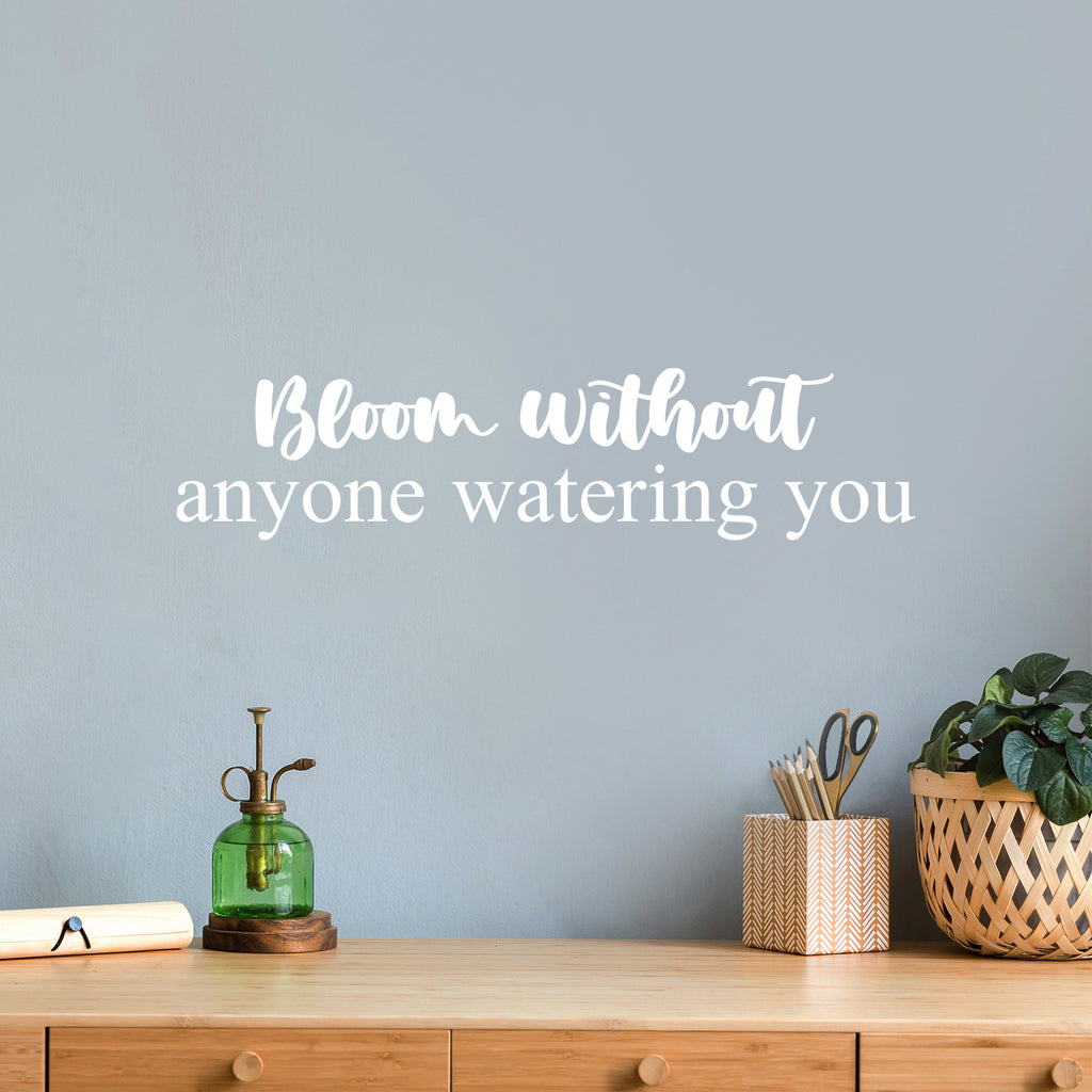 This awesome cute & inspiring decal quote "Bloom Without Anyone Watering You"; is the perfect touch for your home. Use it for your bedroom; fitness center; office or anywhere you want to bring some extra positive decoration. It's a vinyl sticker that is easy to put on any smooth and dry surface. Our modern designs don't just brighten up the room; but brighten up the day. Using top of the line vinyl across all of our production allows us to be the leaders in quality and design.