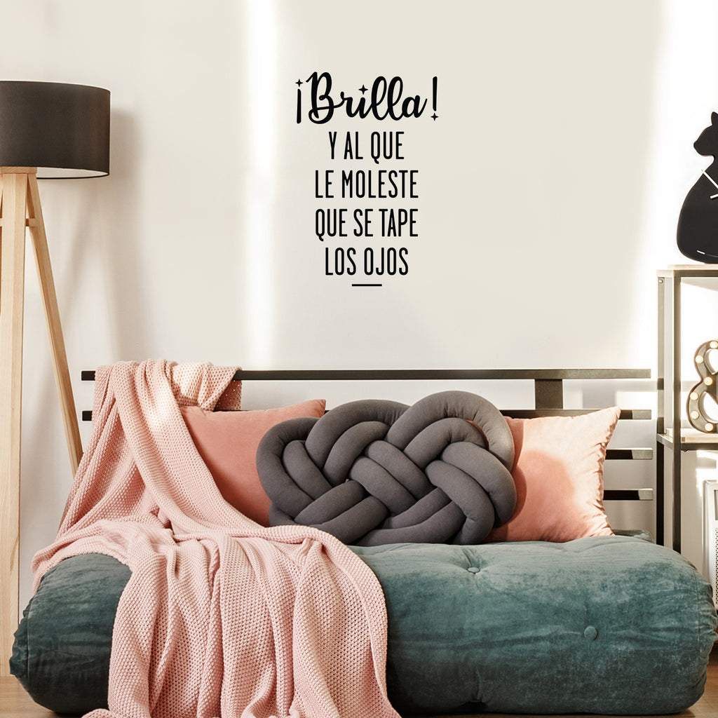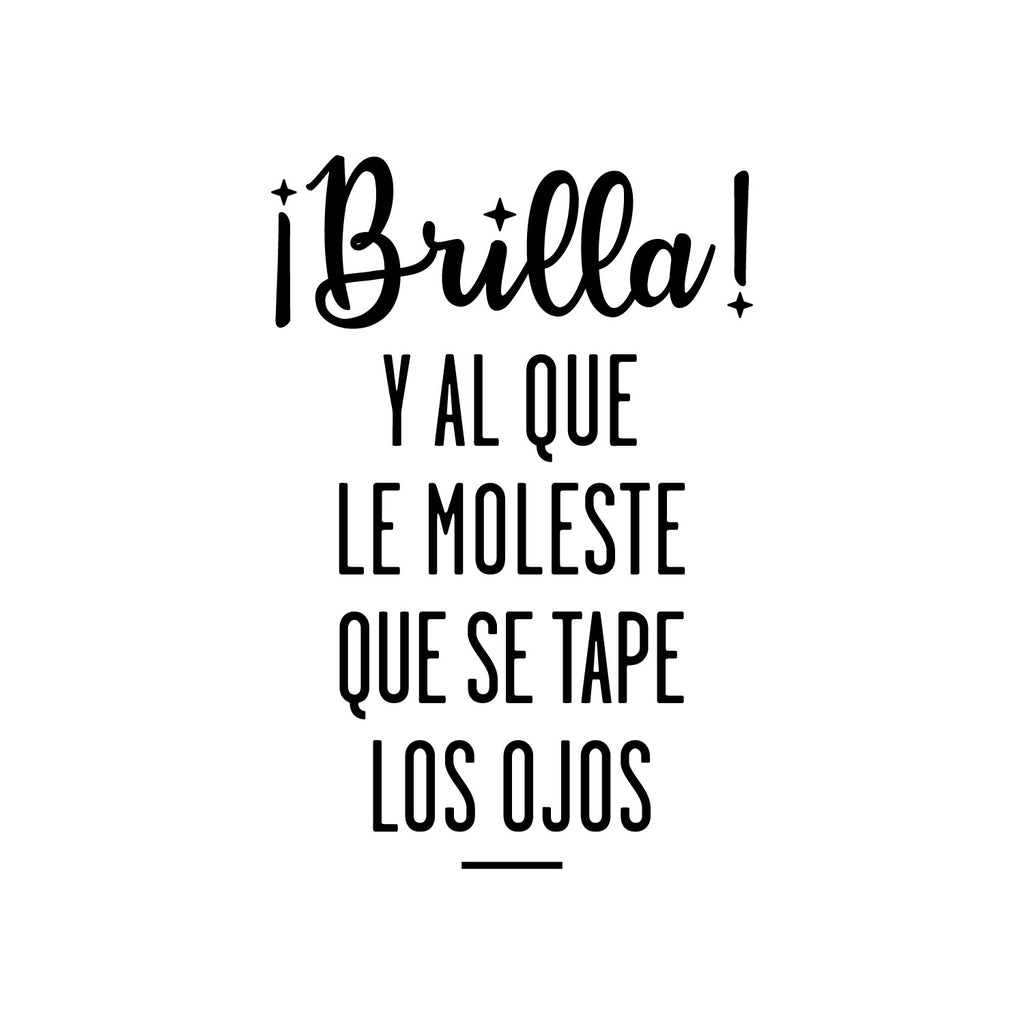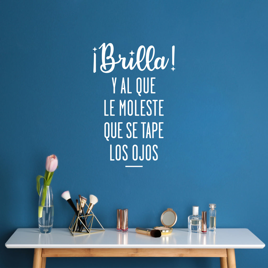 This awesome positive & inspirational decal quote "Brilla! Y Al Que Le Moleste Que Se Tape Los Ojos / Shine! And The One Who Bothers To Cover His Eyes"; is the perfect touch for your home or office. Use it for your business; coffee shop; bathroom or anywhere you want to bring some extra positive decoration. It's a vinyl sticker that is easy to put on any smooth and dry surface. Our modern designs don't just brighten up the room; but brighten up the day. Using top of the line vinyl across all of our production allows us to be the leaders in quality and design.