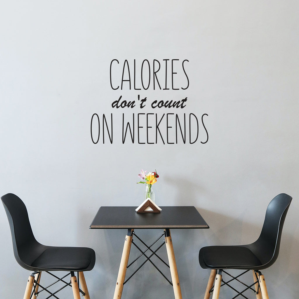 This decal quote "Calories Don't Count On Weekends"; is the perfect touch for your home. Use it for your kitchen; living room; office kitchenette or anywhere you want to bring some extra decoration. It's a vinyl sticker that is easy to put on any smooth and dry surface. Our modern designs don't just brighten up the room; but brighten up the day. Using top of the line vinyl across all of our production allows us to be the leaders in quality and design.