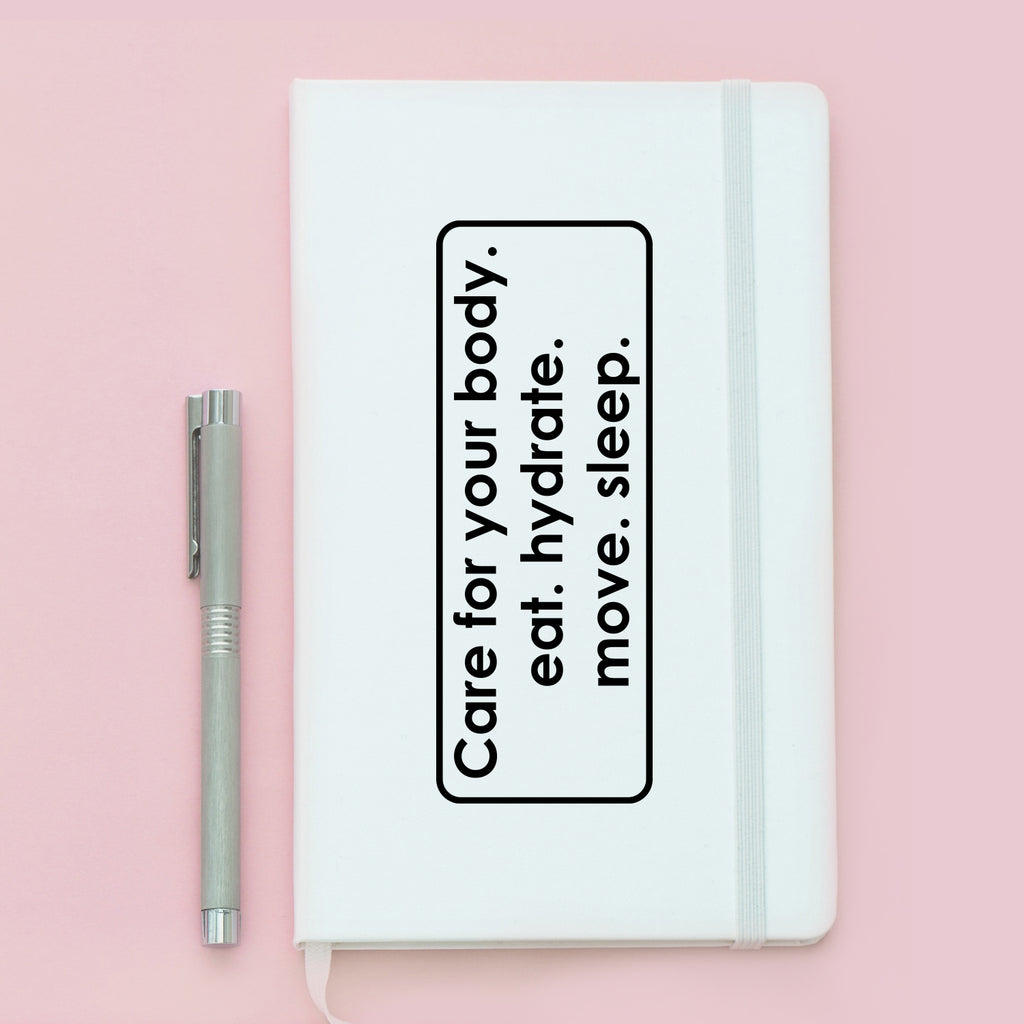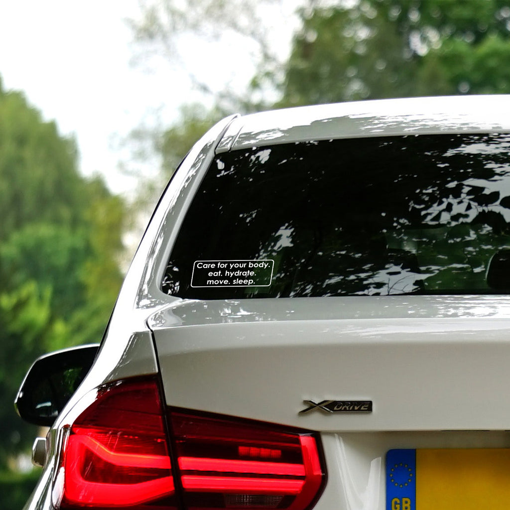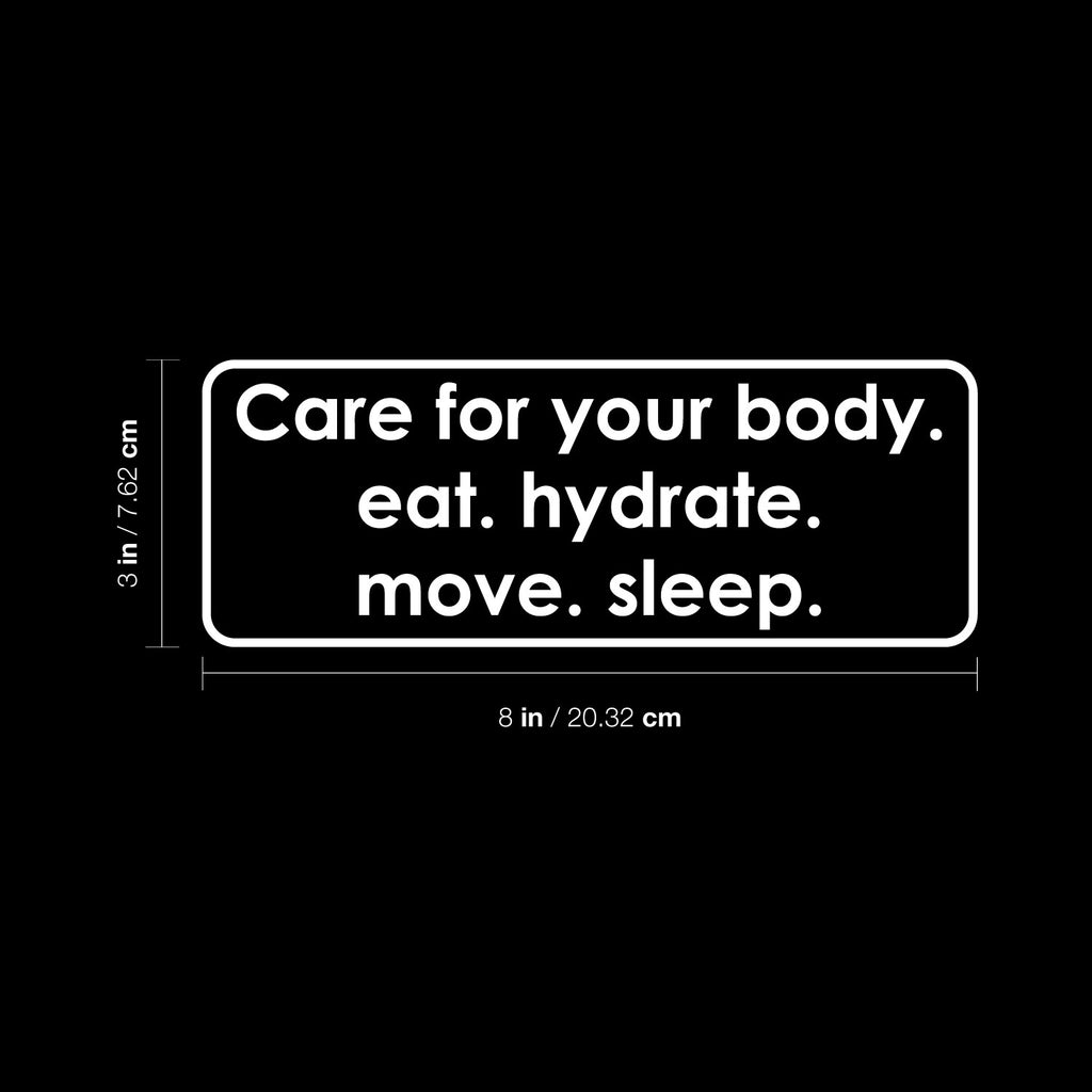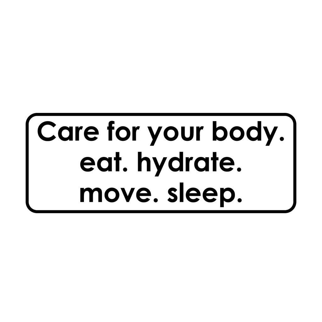 This awesome positive decal quote "Care For Your Body Eat Hydrate Move Sleep"; is the perfect touch for your fitness center or home. Use it for your laptops; notebook; mugs; thermos or anywhere you want to bring some extra positive decoration. It's a vinyl sticker that is easy to put on any smooth and dry surface. Our modern designs don't just brighten up the room; but brighten up the day. Using top of the line vinyl across all of our production allows us to be the leaders in quality and design.