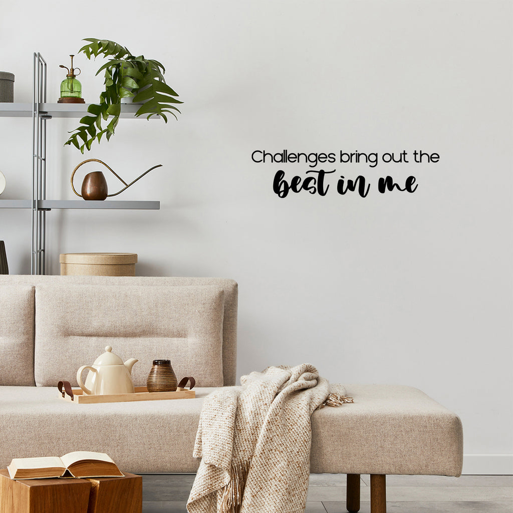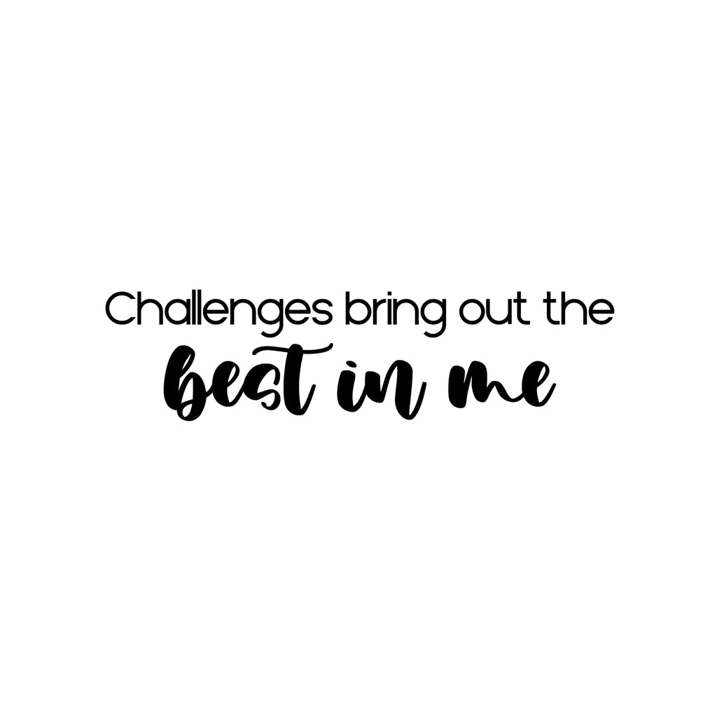 This modern positive & motivational decal quote "Challenges Bring Out The Best In Me"; is the perfect touch for your wellness center or home. Use it for your bedroom; fitness center; office or anywhere you want to bring some extra positive decoration. It's a vinyl sticker that is easy to put on any smooth and dry surface. Our modern designs don't just brighten up the room; but brighten up the day. Using top of the line vinyl across all of our production allows us to be the leaders in quality and design.