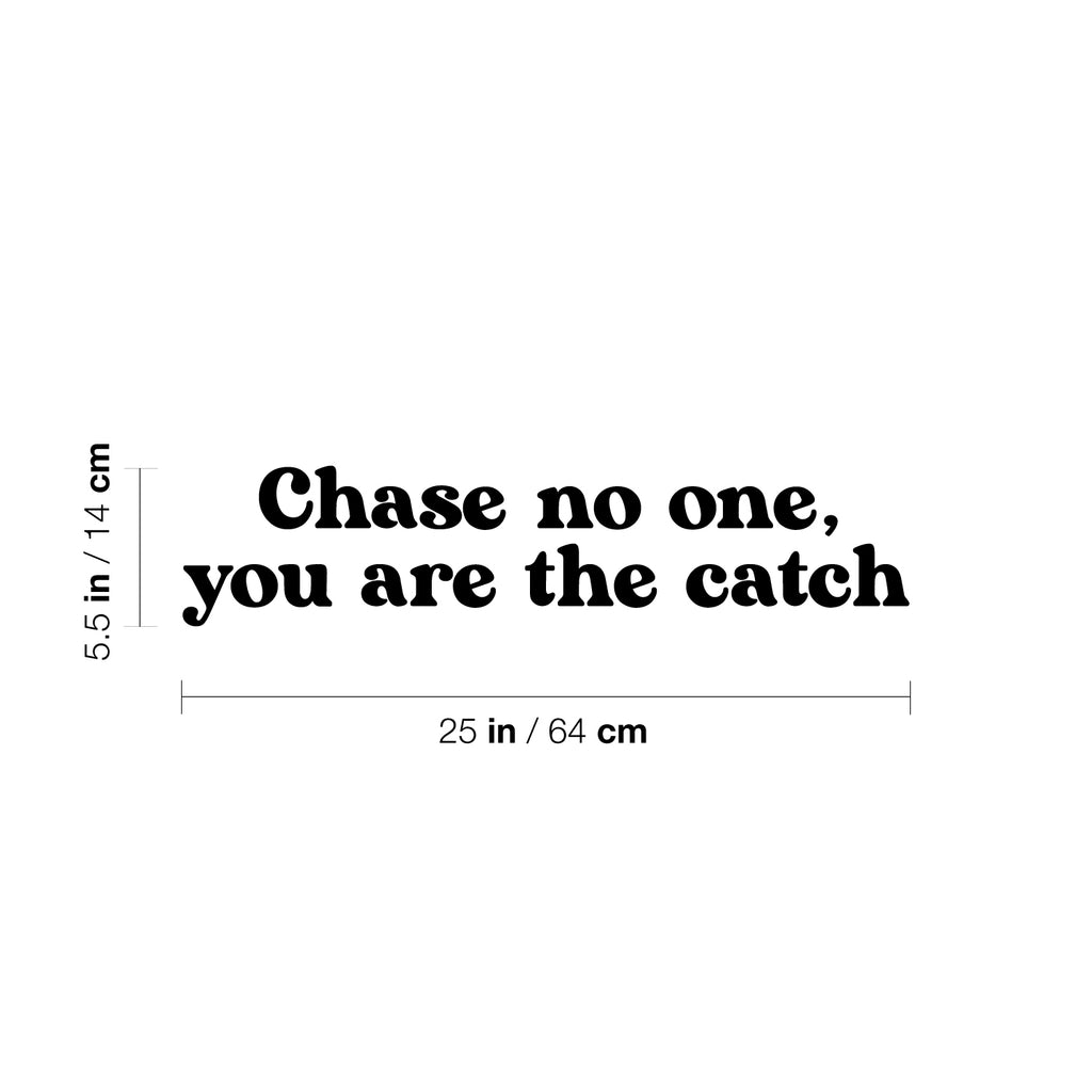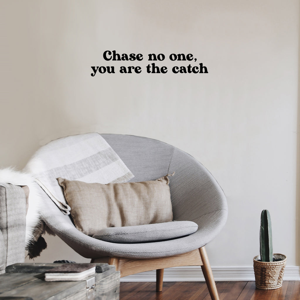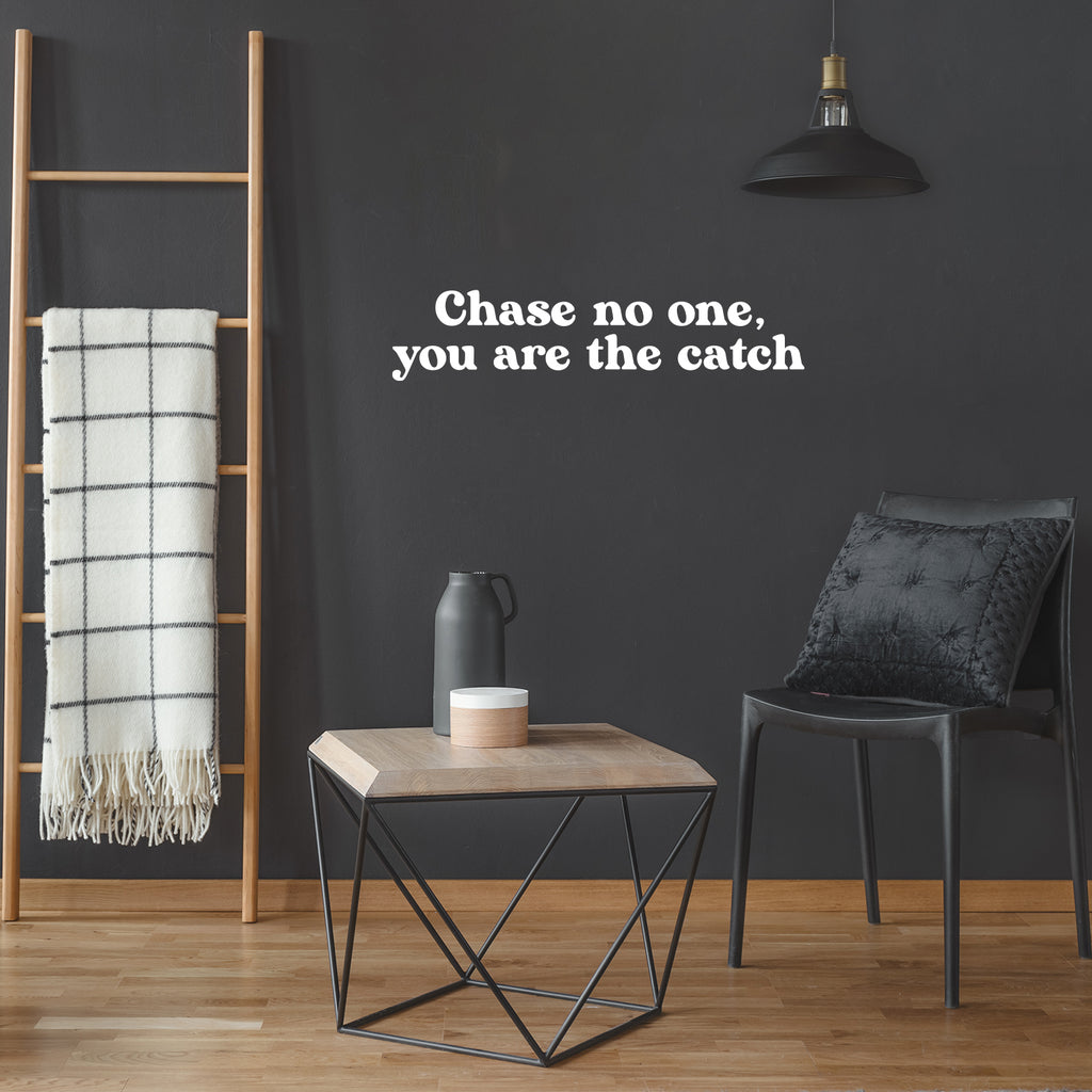 This awesome cute & inspiring decal quote "Chase No One; You Are The Catch"; is the perfect touch for your home or office. Use it for your make up mirror; bathroom; closet or anywhere you want to bring some extra positive decoration. It's a vinyl sticker that is easy to put on any smooth and dry surface. Our modern designs don't just brighten up the room; but brighten up the day. Using top of the line vinyl across all of our production allows us to be the leaders in quality and design.