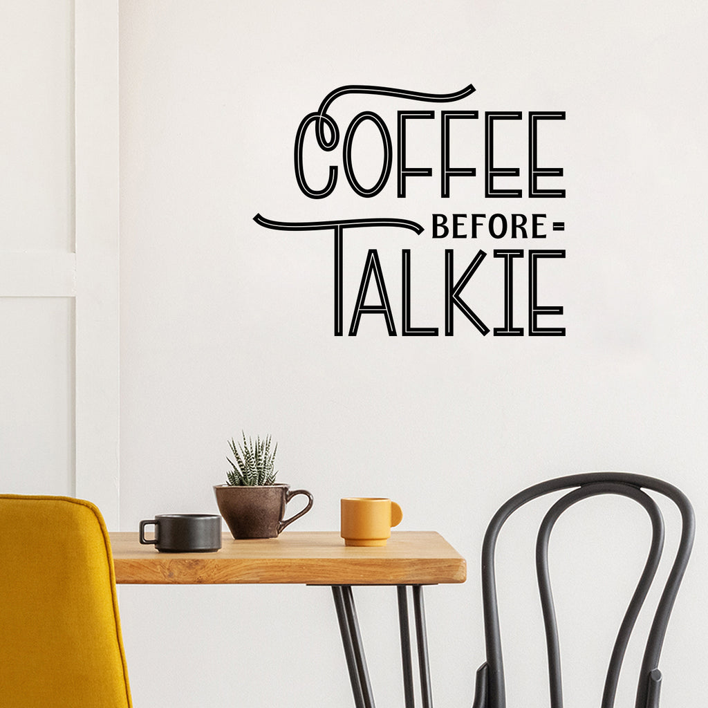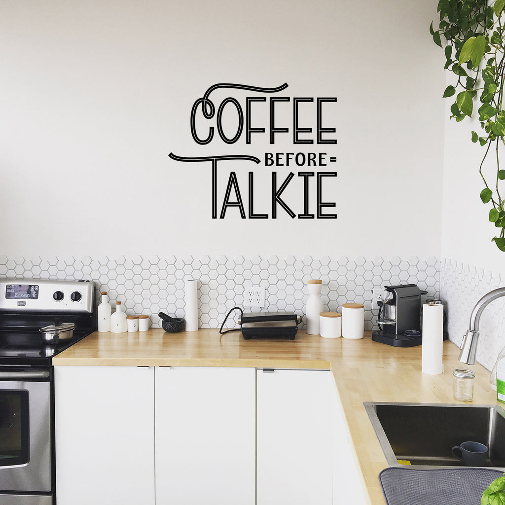 This design decal quote "Coffee Before Talkie"; is the perfect touch for your office or coffee shop. Use it for your dining room; restaurant; kitchen or anywhere you want to bring some extra fun decoration. It's a vinyl sticker that is easy to put on any smooth and dry surface. Our modern designs don't just brighten up the room; but brighten up the day. Using top of the line vinyl across all of our production allows us to be the leaders in quality and design.