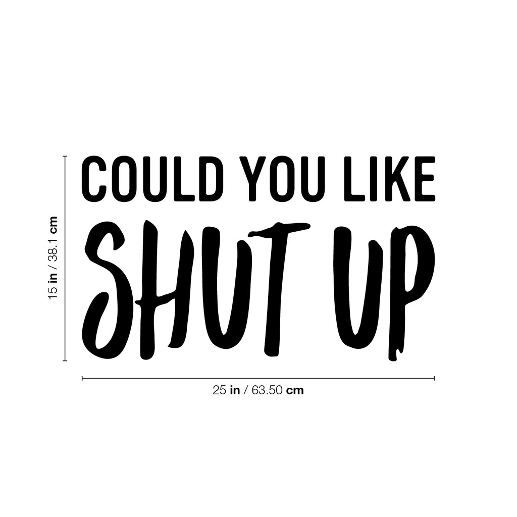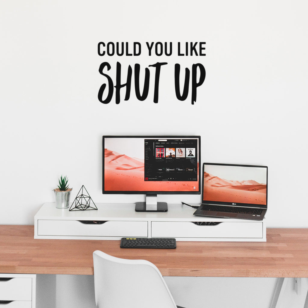 This awesome funny & sarcastic decal quote "Could You Like Shut Up"; is the perfect touch for your home or office. Use it for your store; coffee shop or anywhere you want to bring some extra fun decoration. It's a vinyl sticker that is easy to put on any smooth and dry surface. Our modern designs don't just brighten up the room; but brighten up the day. Using top of the line vinyl across all of our production allows us to be the leaders in quality and design.