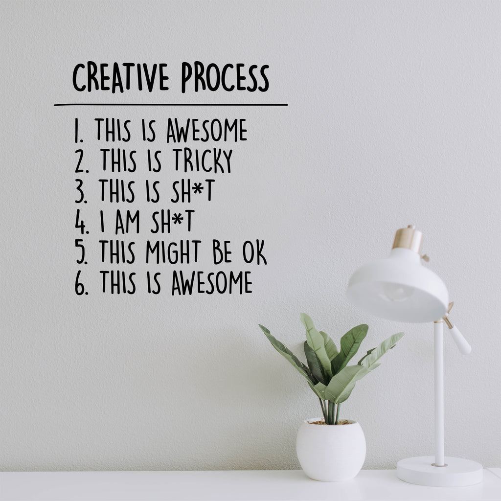 This awesome positive & sarcastic decal quote "Creative Process"; is the perfect touch for your home or office. Use it for your store; coffee shop or anywhere you want to bring some extra fun decoration. It's a vinyl sticker that is easy to put on any smooth and dry surface. Our modern designs don't just brighten up the room; but brighten up the day. Using top of the line vinyl across all of our production allows us to be the leaders in quality and design.