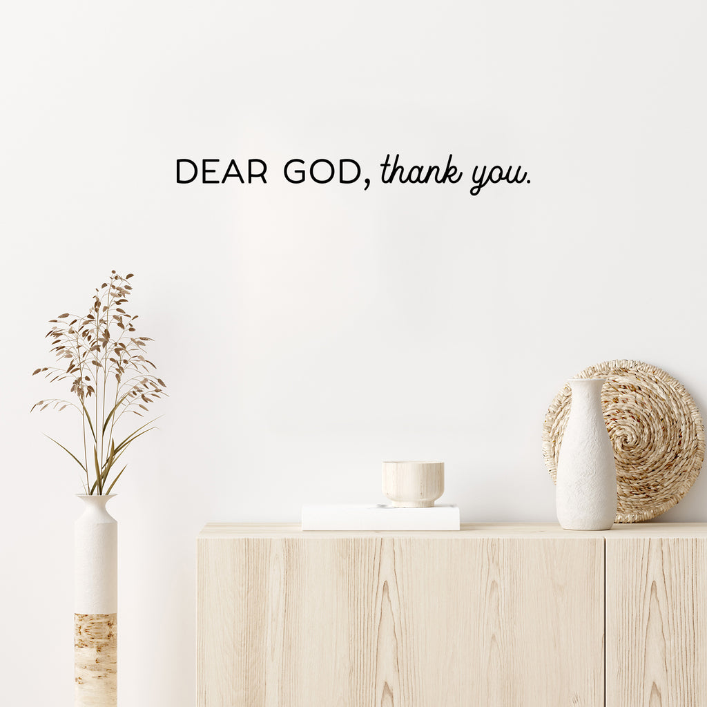 This awesome cute & spiritual decal quote "Dear God; Thank You"; is the perfect touch for your home. Use it for your kids room; living room or anywhere you want to bring some extra decoration. It's a vinyl sticker that is easy to put on any smooth and dry surface. Our modern designs don't just brighten up the room; but brighten up the day. Using top of the line vinyl across all of our production allows us to be the leaders in quality and design.