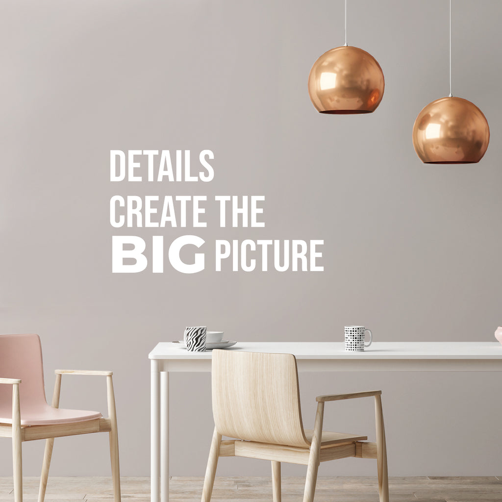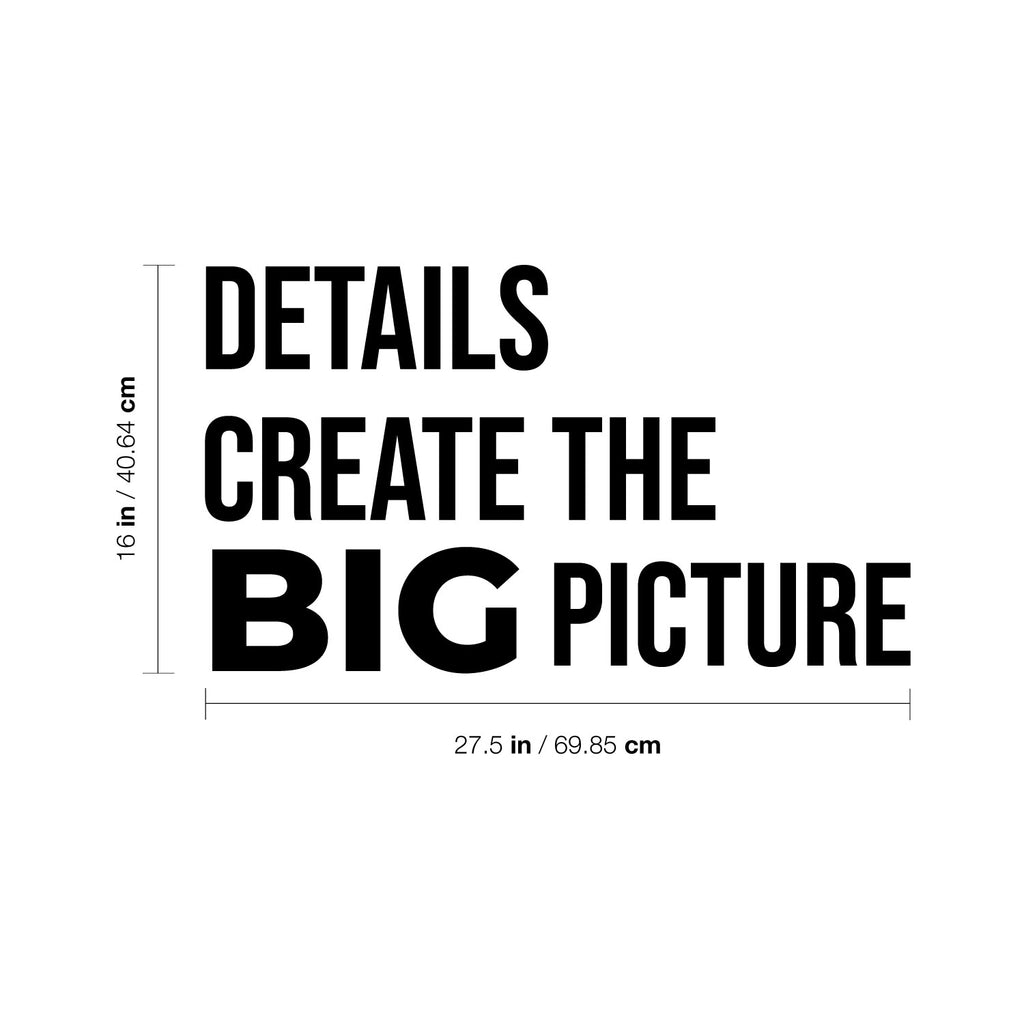 This awesome positive decal quote "Details Create The Big Picture"; is the perfect touch for your home or office. Use it for your gym storefront; coffee shop or anywhere you want to bring some extra inspiring decoration. It's a vinyl sticker that is easy to put on any smooth and dry surface. Our modern designs don't just brighten up the room; but brighten up the day. Using top of the line vinyl across all of our production allows us to be the leaders in quality and design.
