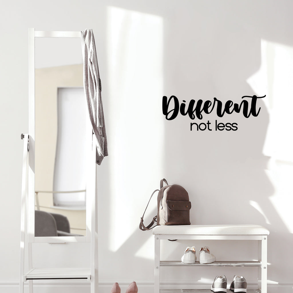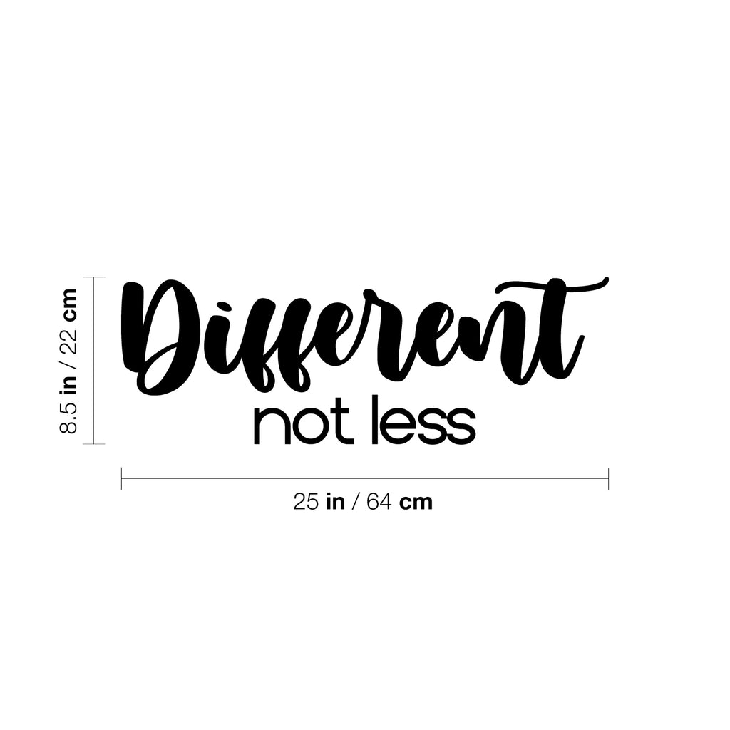 This awesome fun decal quote "Different Not Less"; is the perfect touch for your home or school. Use it for your living room; playroom; office or anywhere you want to bring some extra cute decoration. It's a vinyl sticker that is easy to put on any smooth and dry surface. Our modern designs don't just brighten up the room; but brighten up the day. Using top of the line vinyl across all of our production allows us to be the leaders in quality and design.