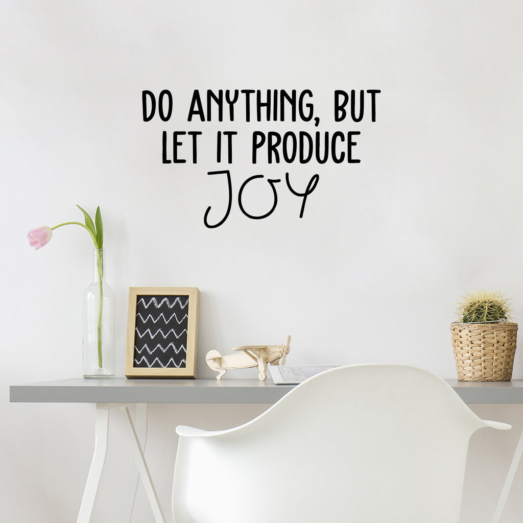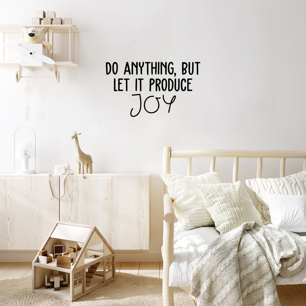 This awesome lovely decal quote "Do Anything; But Let It Produce Joy" is the perfect touch for your home. Use it for your nursery; playroom; kids room or anywhere you want to bring some extra cute decoration. It's a vinyl sticker that is easy to put on any smooth and dry surface. Our modern designs don't just brighten up the room; but brighten up the day. Using top of the line vinyl across all of our production allows us to be the leaders in quality and design.