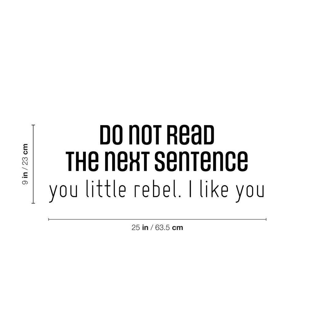This awesome funny & sarcastic decal quote "Do Not Read The Next Sentence"; is the perfect touch for your home or office. Use it for your store; coffee shop or anywhere you want to bring some extra funny decoration. It's a vinyl sticker that is easy to put on any smooth and dry surface. Our modern designs don't just brighten up the room; but brighten up the day. Using top of the line vinyl across all of our production allows us to be the leaders in quality and design.