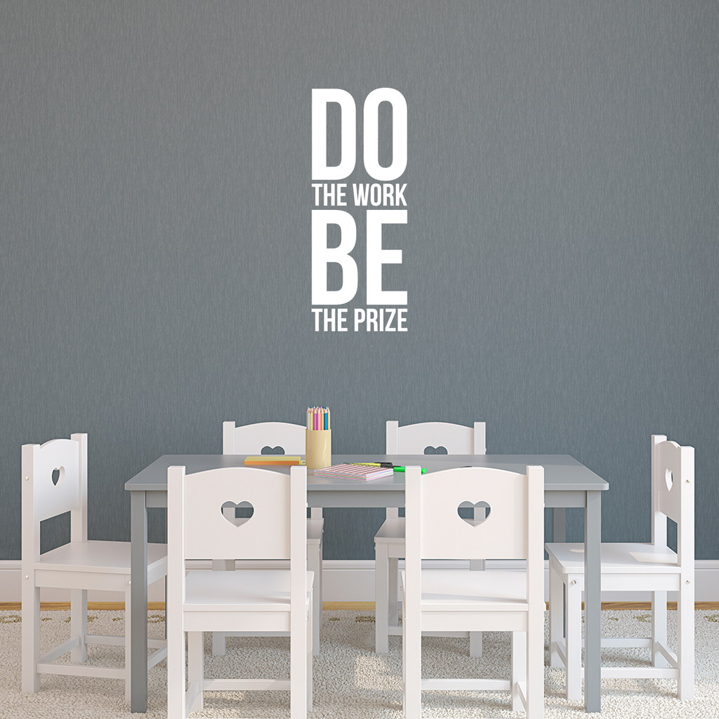 This awesome inspirational decal quote "Do The Work Be The Prize"; is the perfect touch for your home or coffee shop. Use it for your bedroom; living room; home office or anywhere you want to bring some extra decoration. It's a vinyl sticker that is easy to put on any smooth and dry surface. Our modern designs don't just brighten up the room; but brighten up the day. Using top of the line vinyl across all of our production allows us to be the leaders in quality and design.