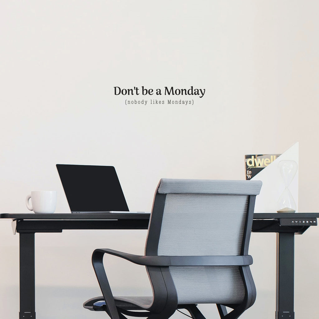 This awesome decal quote "Don't Be A Monday (Nobody Likes Mondays)"; is the perfect touch for your home. Use it for your bedroom; living room; office or anywhere you want to bring some extra decoration. It's a vinyl sticker that is easy to put on any smooth and dry surface. Our modern designs don't just brighten up the room; but brighten up the day. Using top of the line vinyl across all of our production allows us to be the leaders in quality and design.