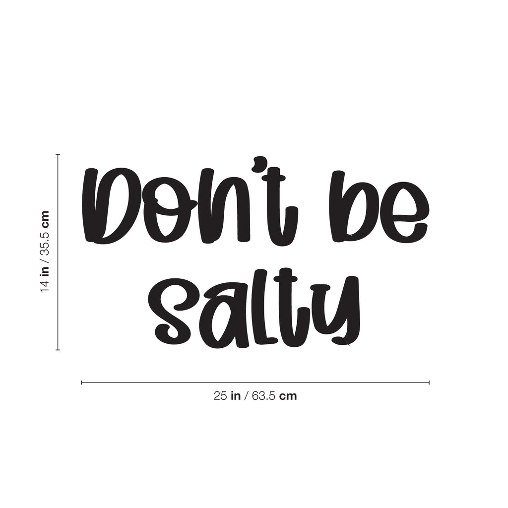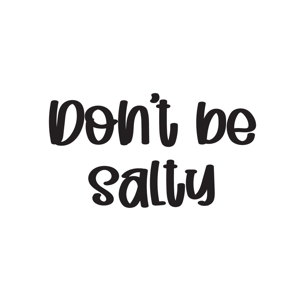 This awesome funny decal quote "Don't Be Salty"; is the perfect touch for your home. Use it for your dining room; restaurant; kitchen or anywhere you want to bring some extra decoration. It's a vinyl sticker that is easy to put on any smooth and dry surface. Our modern designs don't just brighten up the room; but brighten up the day. Using top of the line vinyl across all of our production allows us to be the leaders in quality and design.