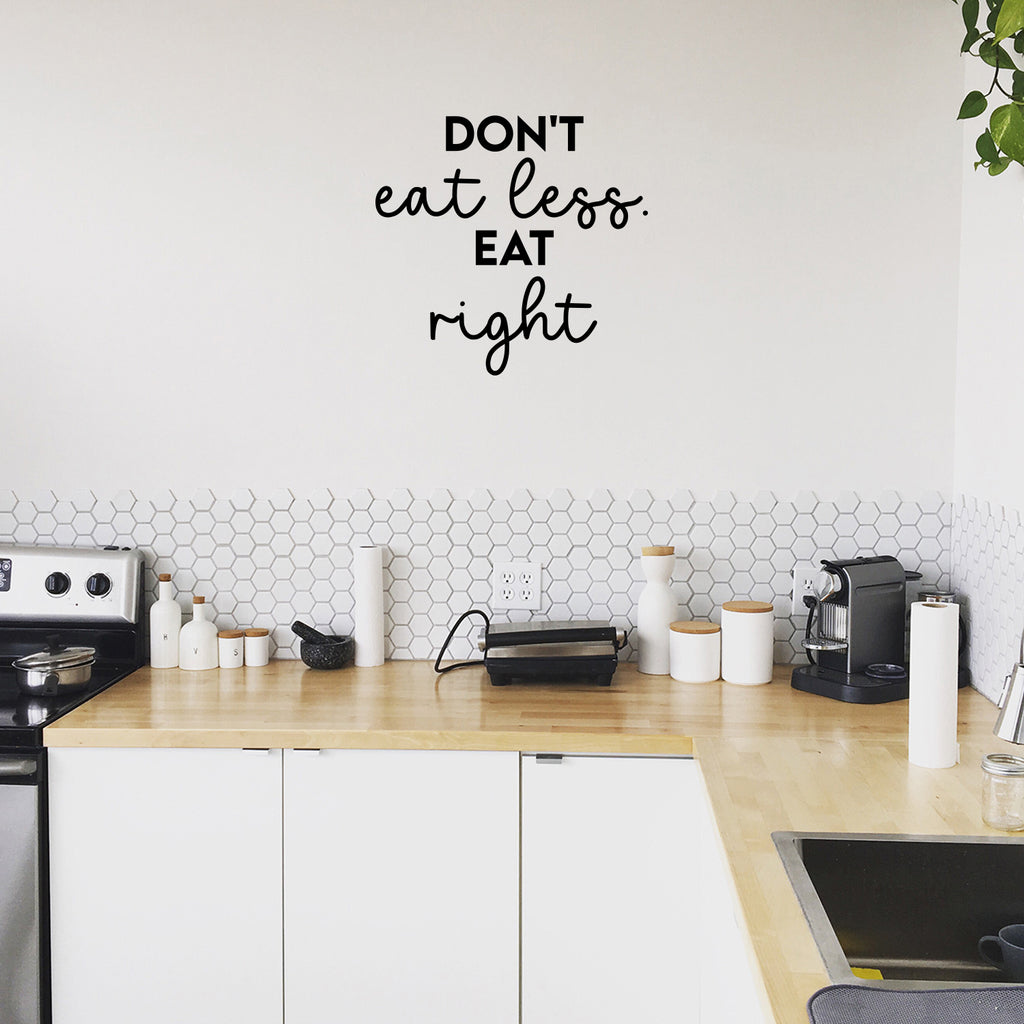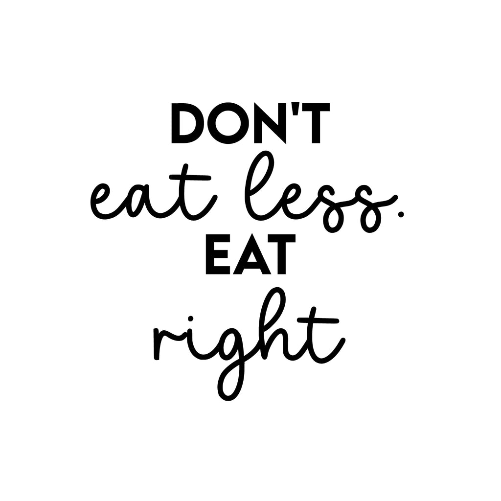 This modern cute & motivational decal quote "Don't Eat Less. Eat Right"; is the perfect touch for your fitness center or home gym. Use it for your home; yoga classes; studio dance or anywhere you want to bring some extra positive decoration. It's a vinyl sticker that is easy to put on any smooth and dry surface. Our modern designs don't just brighten up the room; but brighten up the day. Using top of the line vinyl across all of our production allows us to be the leaders in quality and design.