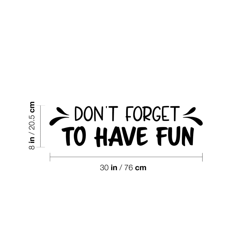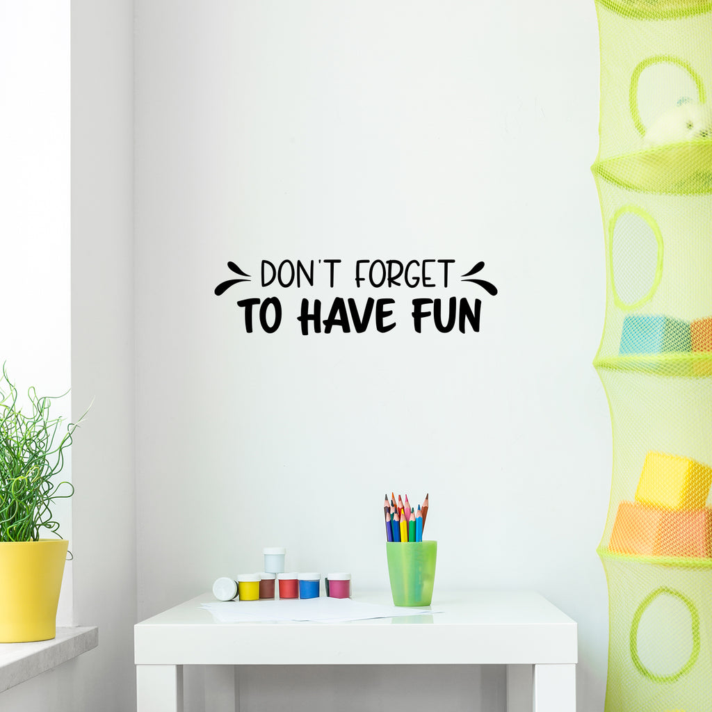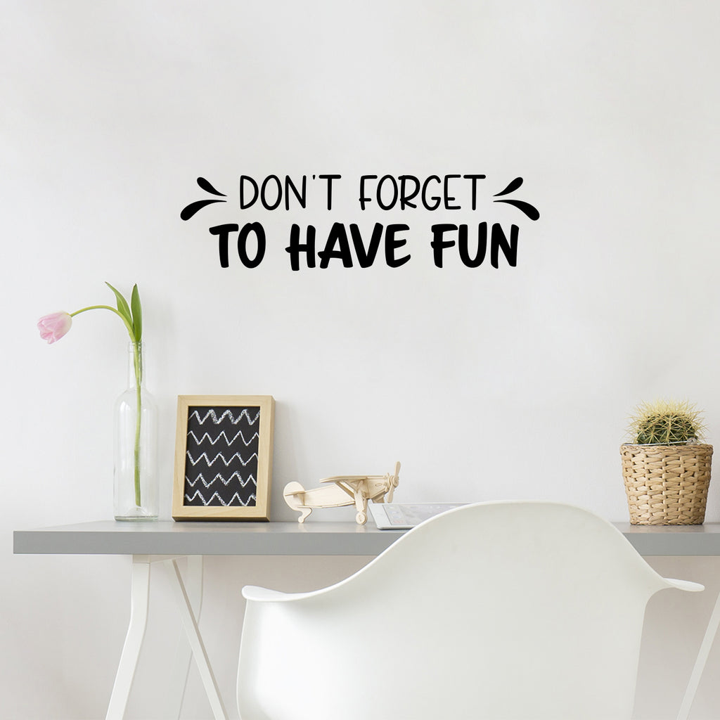 This decal quote "Don't Forget To Have Fun" is the perfect touch for your home or school. Use it for your bedroom; playroom; kids room or anywhere you want to bring some extra cute decoration. It's a vinyl sticker that is easy to put on any smooth and dry surface. Our modern designs don't just brighten up the room; but brighten up the day. Using top of the line vinyl across all of our production allows us to be the leaders in quality and design.