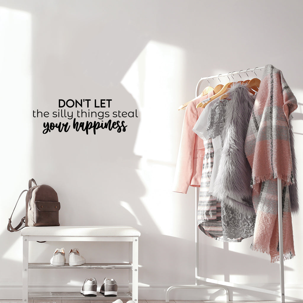 This awesome inspiring decal quote "Don't Let The Silly Things Steal Your Happiness"; is the perfect touch for your fitness center or home. Use it for your wellness clinic; healthy center; storefront or anywhere you want to bring some extra positive decoration. It's a vinyl sticker that is easy to put on any smooth and dry surface. Our modern designs don't just brighten up the room; but brighten up the day. Using top of the line vinyl across all of our production allows us to be the leaders in quality and design.