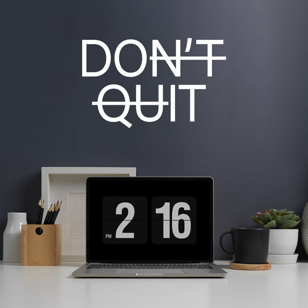 This trendy positive decal quote "Don't Quit"; is the perfect touch for your office or classroom. Use it for your living room; school; coffee shop or anywhere you want to bring some extra positive decoration. It's a vinyl sticker that is easy to put on any smooth and dry surface. Our modern designs don't just brighten up the room; but brighten up the day. Using top of the line vinyl across all of our production allows us to be the leaders in quality and design.