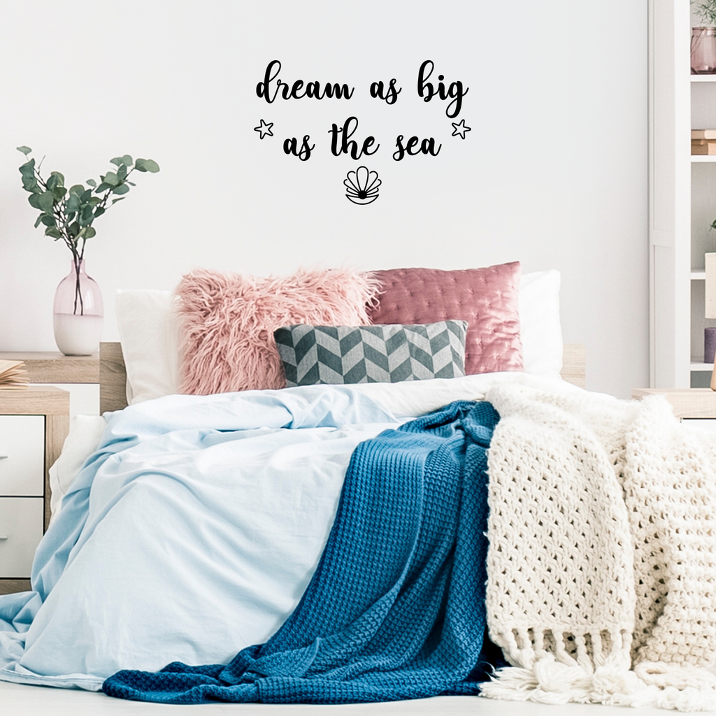 This awesome optimistic decal quote "Dream As Big As The Sea"; is the perfect touch for your home or store. Use it for your bedroom; living room or anywhere you want to bring some extra cute decoration. It's a vinyl sticker that is easy to put on any smooth and dry surface. Our modern designs don't just brighten up the room; but brighten up the day. Using top of the line vinyl across all of our production allows us to be the leaders in quality and design.