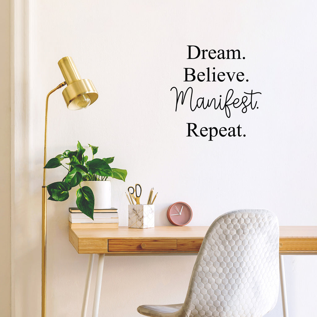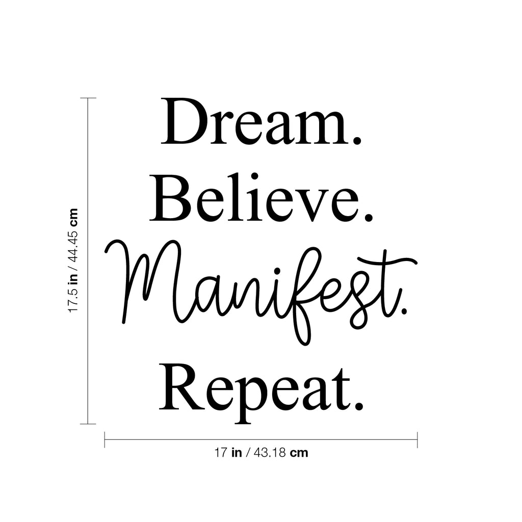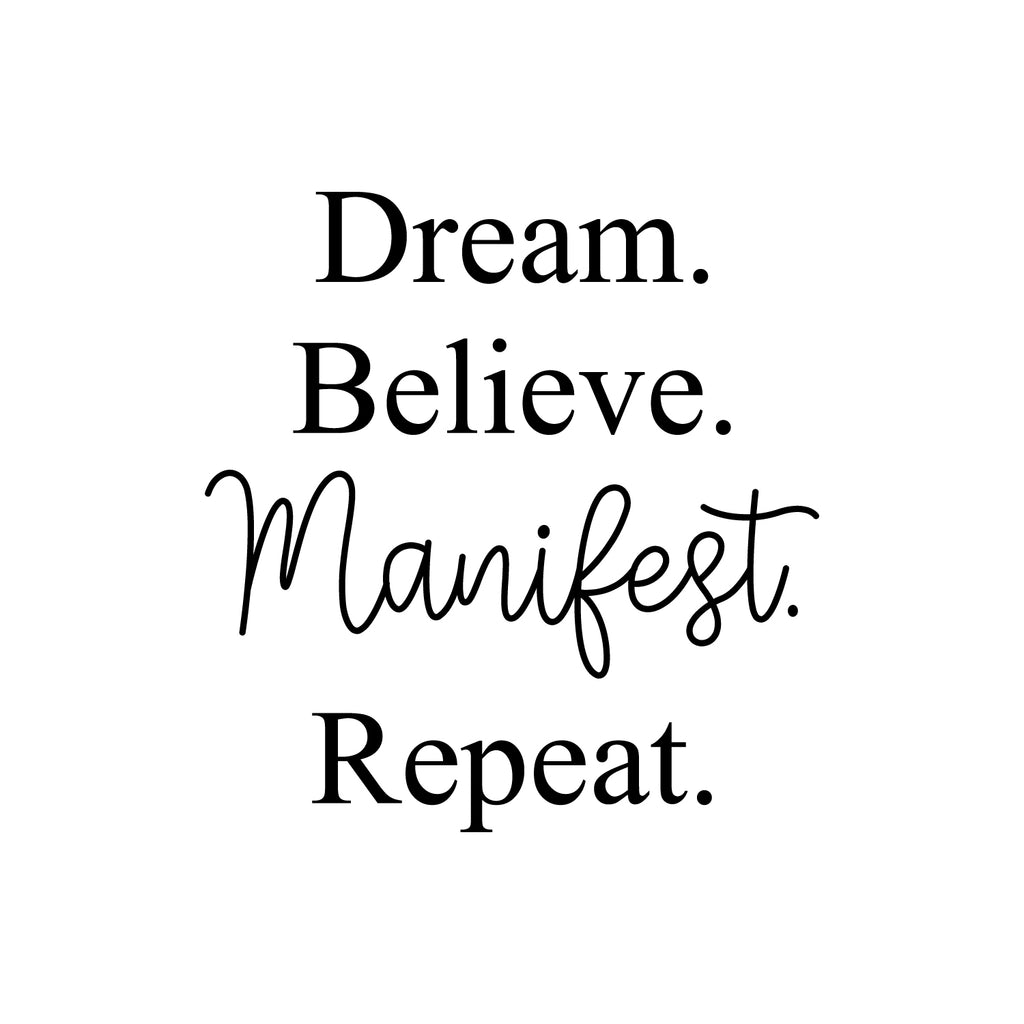 This modern cute & motivational decal quote "Dream Believe Manifest Repeat"; is the perfect touch for your fitness center or home gym. Use it for your home; yoga classes; studio dance or anywhere you want to bring some extra positive decoration. It's a vinyl sticker that is easy to put on any smooth and dry surface. Our modern designs don't just brighten up the room; but brighten up the day. Using top of the line vinyl across all of our production allows us to be the leaders in quality and design.