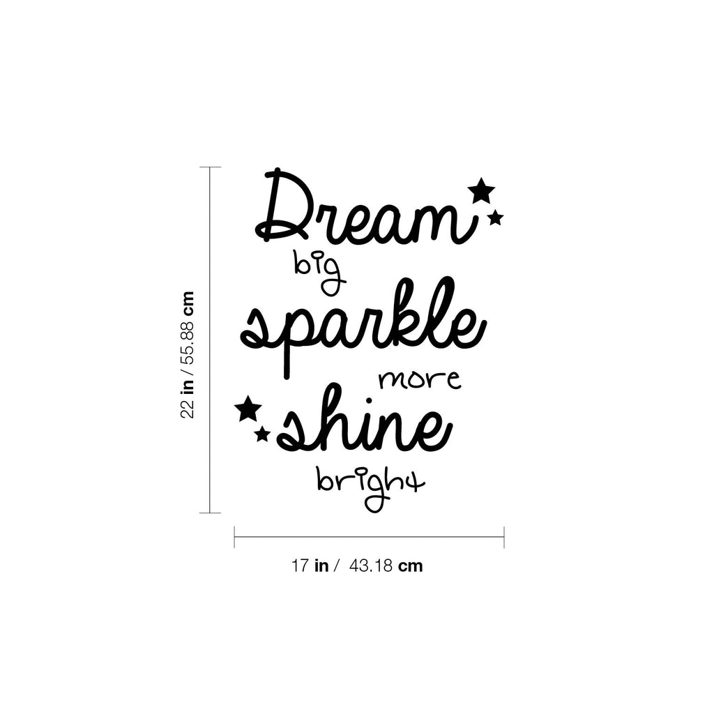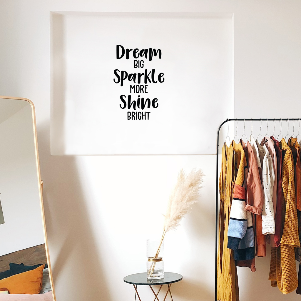 This awesome decal quote "Dream Big Sparkle More Shine Bright"; is the perfect touch for your home. Use it for your home office; living room or anywhere you want to bring some extra girly decoration. It's a vinyl sticker that is easy to put on any smooth and dry surface. Our modern designs don't just brighten up the room; but brighten up the day. Using top of the line vinyl across all of our production allows us to be the leaders in quality and design.