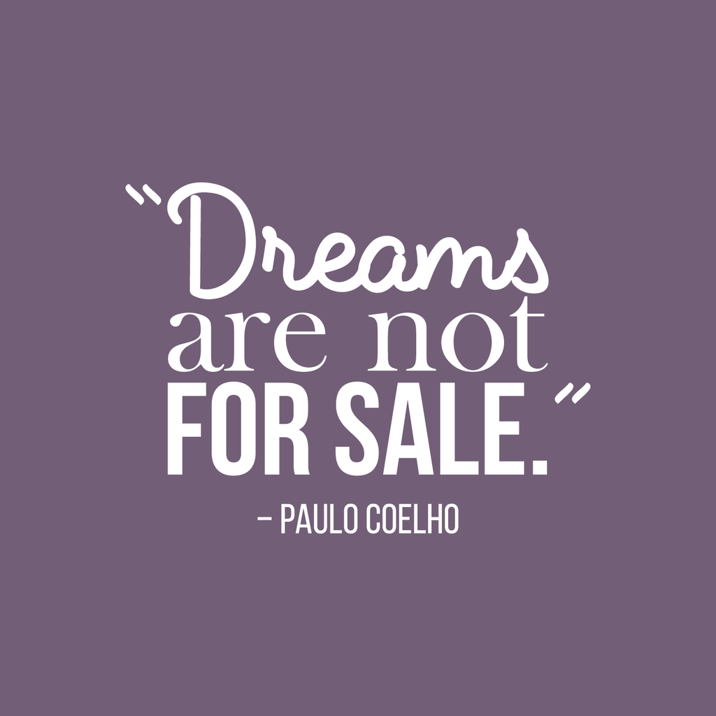 This awesome decal quote "Dreams Are Not For Sale - Paulo Coelho" is the perfect touch for your home or office. Use it for your bedroom; office; living room or anywhere you want to bring some extra decoration. It's a vinyl sticker that is easy to put on any smooth and dry surface. Our modern designs don't just brighten up the room; but brighten up the day. Using top of the line vinyl across all of our production allows us to be the leaders in quality and design.