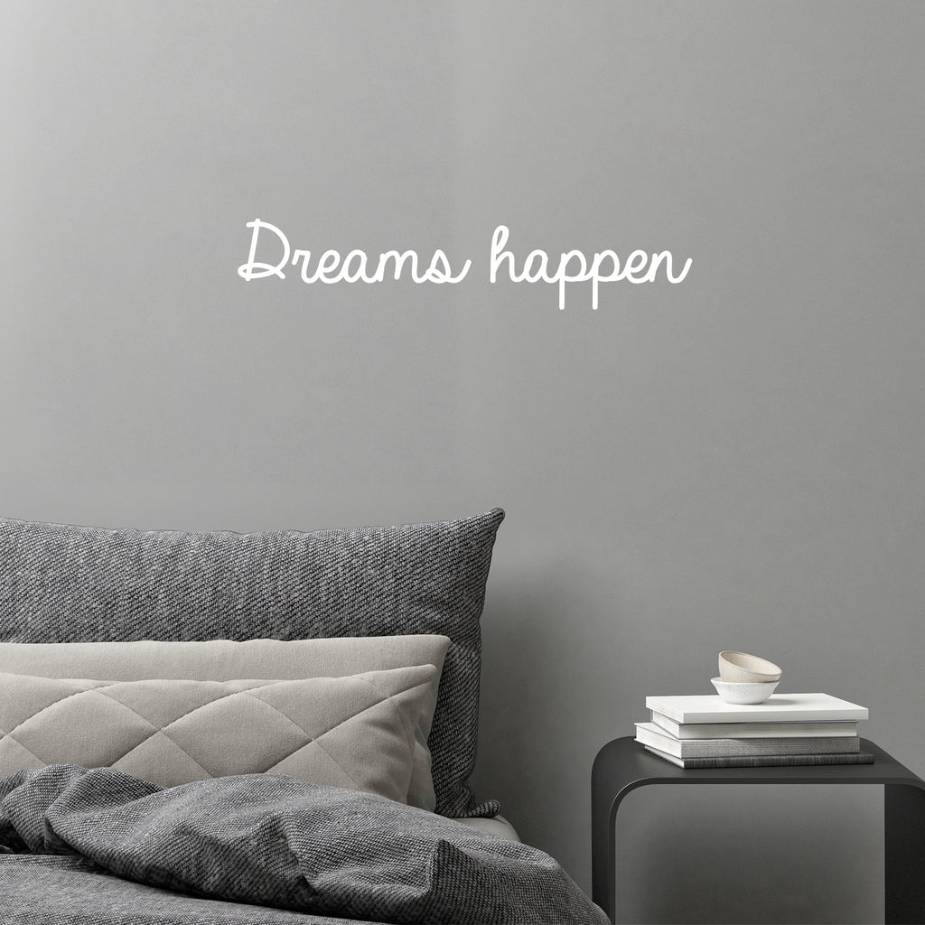 This awesome decal quote "Dreams Happen"; is the perfect touch for your home. Use it for your home office; living room or anywhere you want to bring some extra girly decoration. It's a vinyl sticker that is easy to put on any smooth and dry surface. Our modern designs don't just brighten up the room; but brighten up the day. Using top of the line vinyl across all of our production allows us to be the leaders in quality and design.