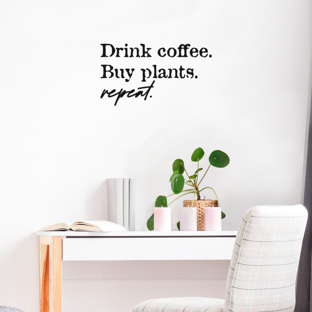 This awesome decal quote "Drink Coffee Buy Plants Repeat"; is the perfect touch for your home. Use it for your kitchen; living room; office kitchenette or anywhere you want to bring some extra decoration. It's a vinyl sticker that is easy to put on any smooth and dry surface. Our modern designs don't just brighten up the room; but brighten up the day. Using top of the line vinyl across all of our production allows us to be the leaders in quality and design.