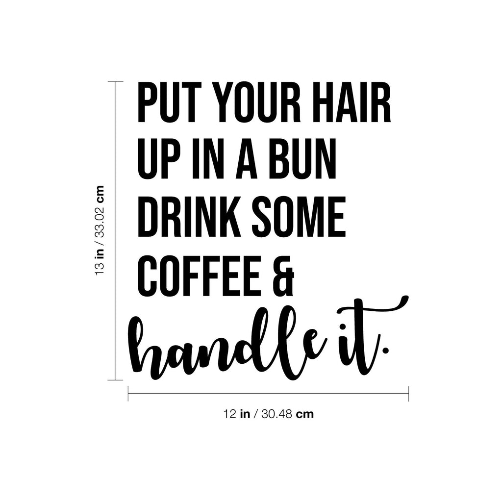 This awesome inspirational decal quote "Put Your Hair Up In A Bun Drink Some Coffee & Handle It"; is the perfect touch for your office or coffee shop. Use it for your dining room; restaurant; kitchen or anywhere you want to bring some extra fun decoration. It's a vinyl sticker that is easy to put on any smooth and dry surface. Our modern designs don't just brighten up the room; but brighten up the day. Using top of the line vinyl across all of our production allows us to be the leaders in quality and design.