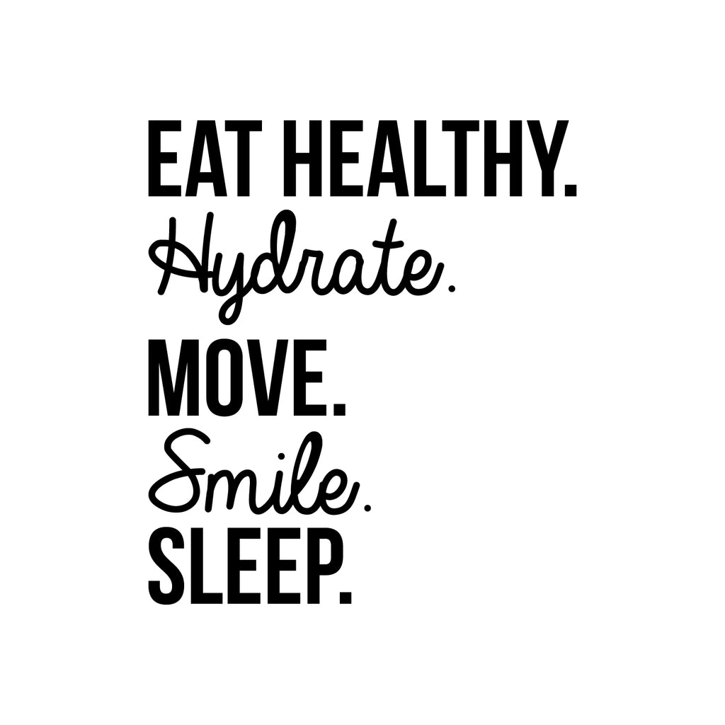 This modern cute & motivational decal quote "Eat Healthy. Hydrate. Move. Smile. Sleep."; is the perfect touch for your fitness center or home gym. Use it for your home; yoga classes; studio dance or anywhere you want to bring some extra positive decoration. It's a vinyl sticker that is easy to put on any smooth and dry surface. Our modern designs don't just brighten up the room; but brighten up the day. Using top of the line vinyl across all of our production allows us to be the leaders in quality and design.