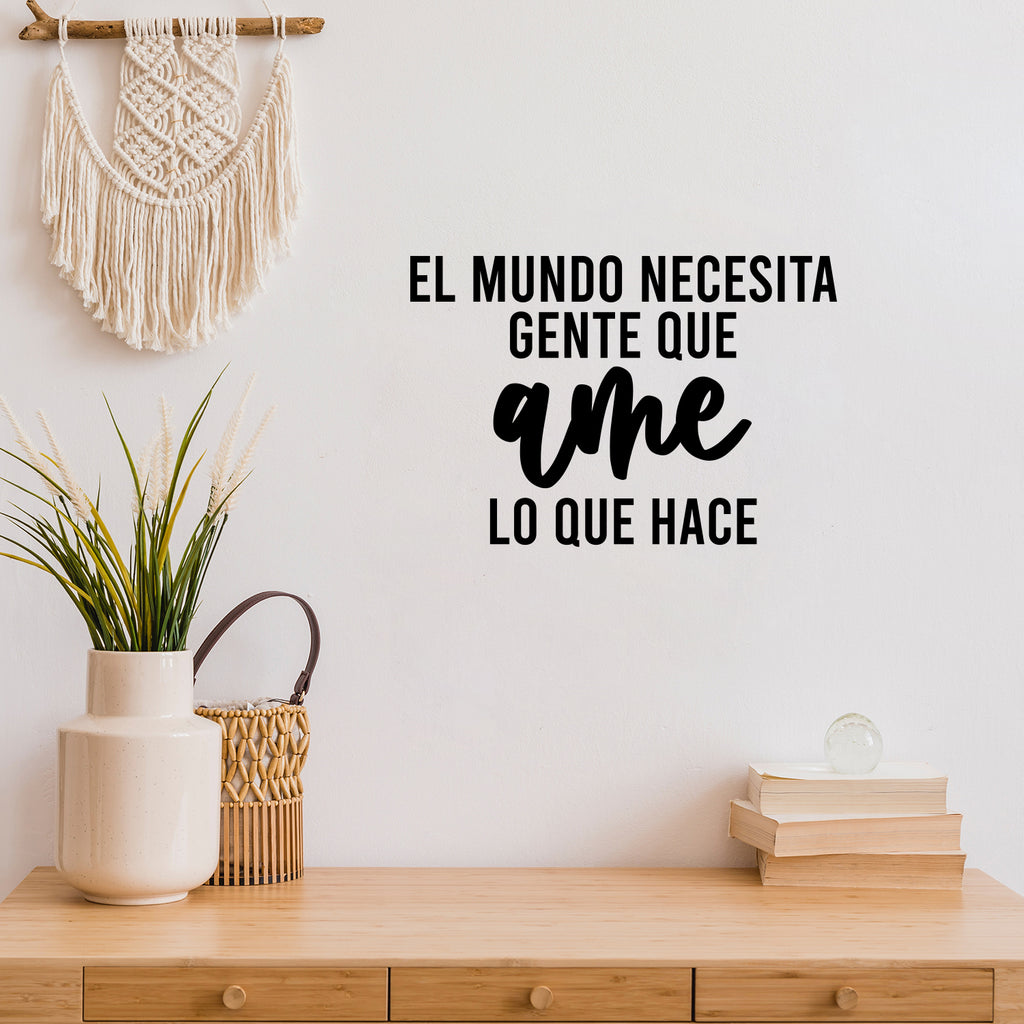 This awesome motivational decal quote "El Mundo Necesita Gente Que Ame Lo Que Hace / The World Needs People Who Love What They Do"; is the perfect touch for your home or office. Use it for your business; coffee shop; bedroom or anywhere you want to bring some extra positive decoration. It's a vinyl sticker that is easy to put on any smooth and dry surface. Our modern designs don't just brighten up the room; but brighten up the day. Using top of the line vinyl across all of our production allows us to be the leaders in quality and design.