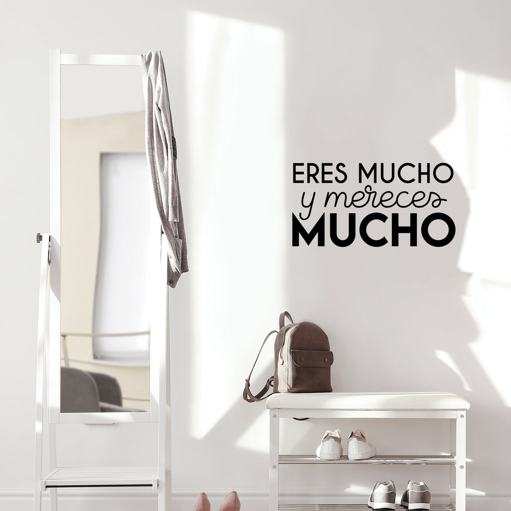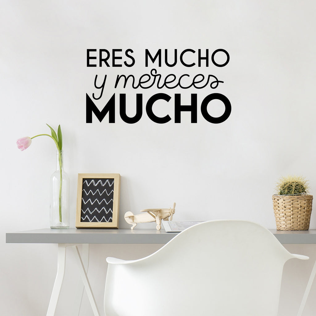 This awesome motivational decal quote "Eres Mucho Y Mereces Mucho / You Are A Lot And You Deserve A Lot"; is the perfect touch for your home or office. Use it for your school; coffee shop; bedroom or anywhere you want to bring some extra positive decoration. It's a vinyl sticker that is easy to put on any smooth and dry surface. Our modern designs don't just brighten up the room; but brighten up the day. Using top of the line vinyl across all of our production allows us to be the leaders in quality and design.