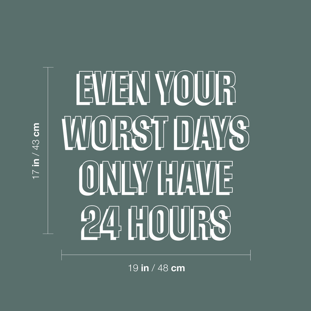 This awesome positive decal quote "Even Your Worst Days Only Have 24 Hours"; is the perfect touch for your home. Use it for your office; fitness center; storefront or anywhere you want to bring some extra positive decoration. It's a vinyl sticker that is easy to put on any smooth and dry surface. Our modern designs don't just brighten up the room; but brighten up the day. Using top of the line vinyl across all of our production allows us to be the leaders in quality and design.
