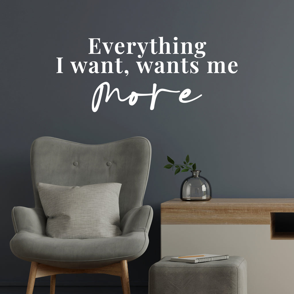 This motivational decal quote "Everything I Want Wants Me More"; is the perfect touch for your home or school. Use it for your living room; classroom or office or anywhere you want to bring some extra cute decoration. It's a vinyl sticker that is easy to put on any smooth and dry surface. Our modern designs don't just brighten up the room; but brighten up the day. Using top of the line vinyl across all of our production allows us to be the leaders in quality and design.