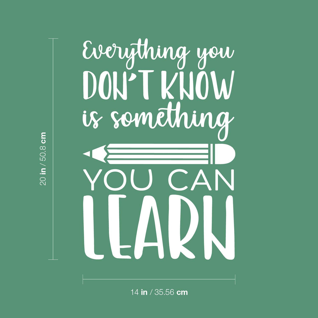 This optimistic decal quote "Everything You Don't Know Is Something You Can Learn"; is the perfect touch for your school or office. Use it for your living room; playroom; kids room or anywhere you want to bring some extra inspirational decoration. It's a vinyl sticker that is easy to put on any smooth and dry surface. Our modern designs don't just brighten up the room; but brighten up the day. Using top of the line vinyl across all of our production allows us to be the leaders in quality and design.