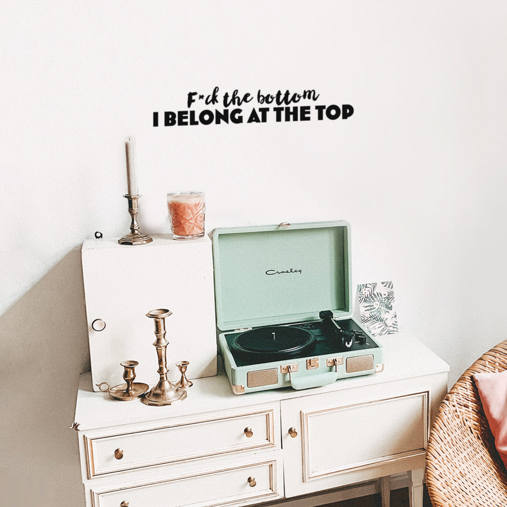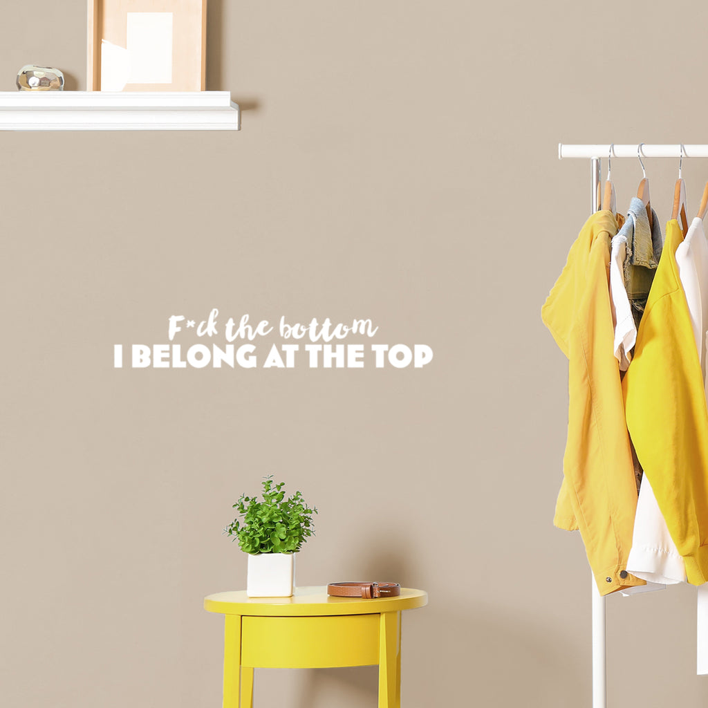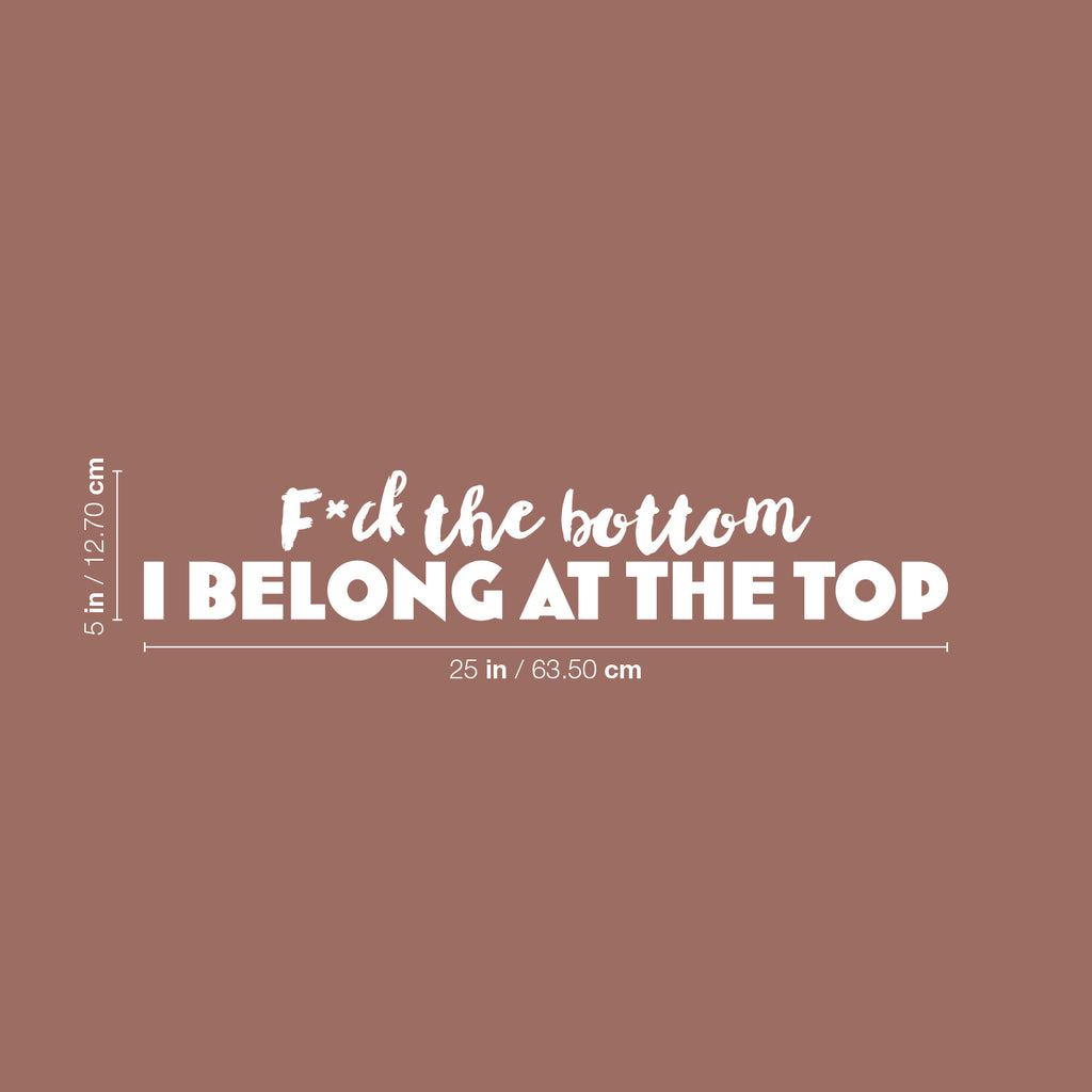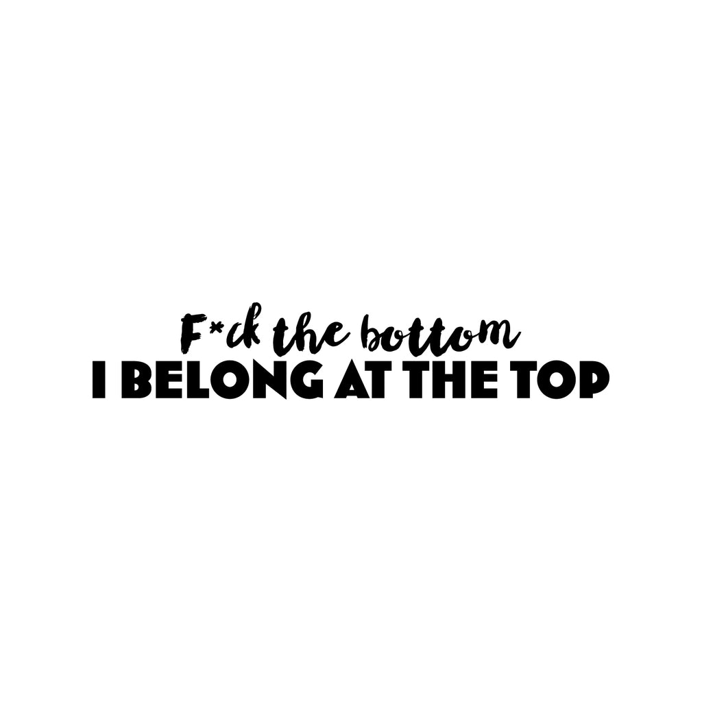 This awesome inspiring & fun decal quote "F*ck The Bottom I Belong At The Top"; is the perfect touch for your home or office. Use it for your living room; coffee shop or anywhere you want to bring some extra fun decoration. It's a vinyl sticker that is easy to put on any smooth and dry surface. Our modern designs don't just brighten up the room; but brighten up the day. Using top of the line vinyl across all of our production allows us to be the leaders in quality and design.