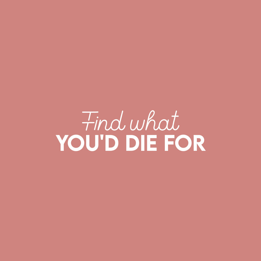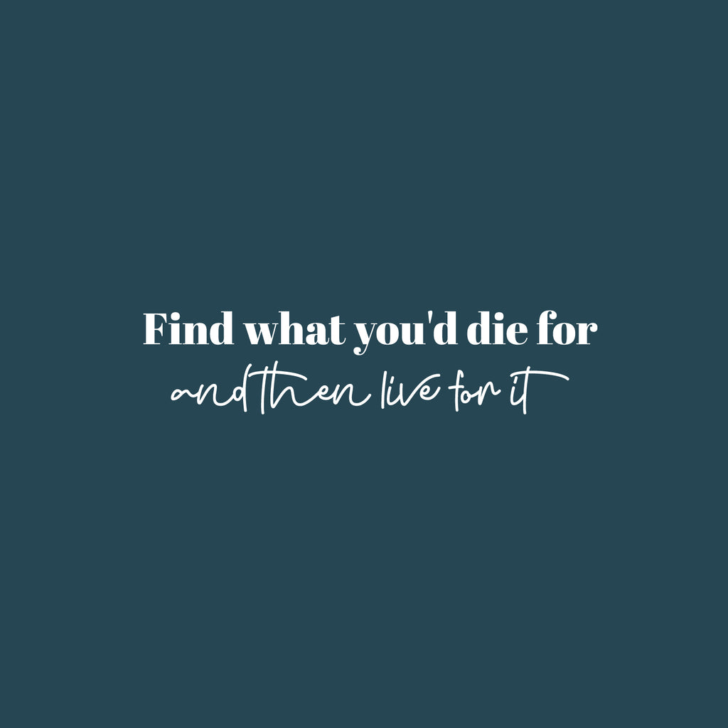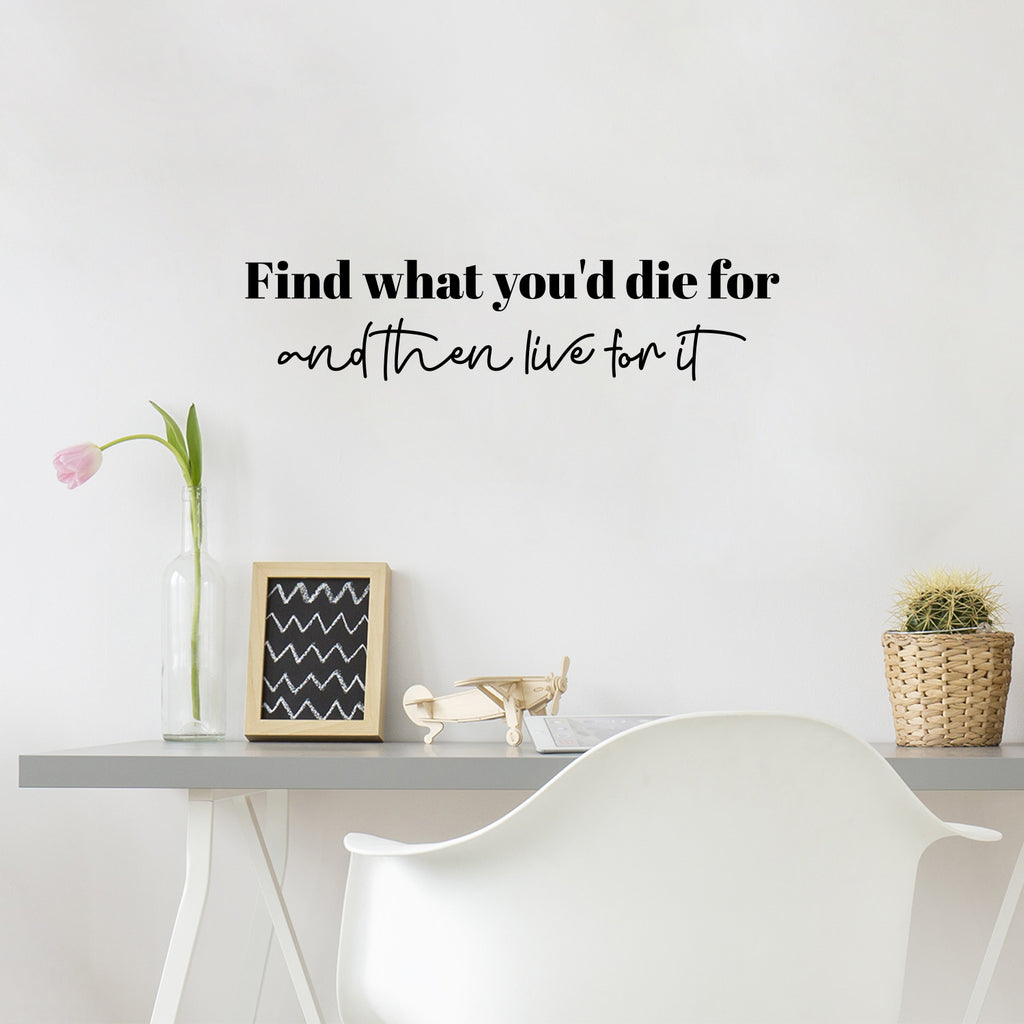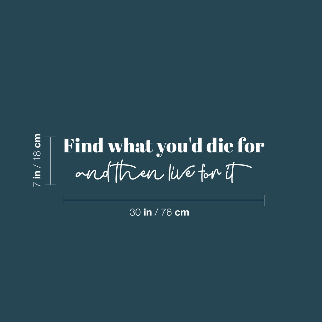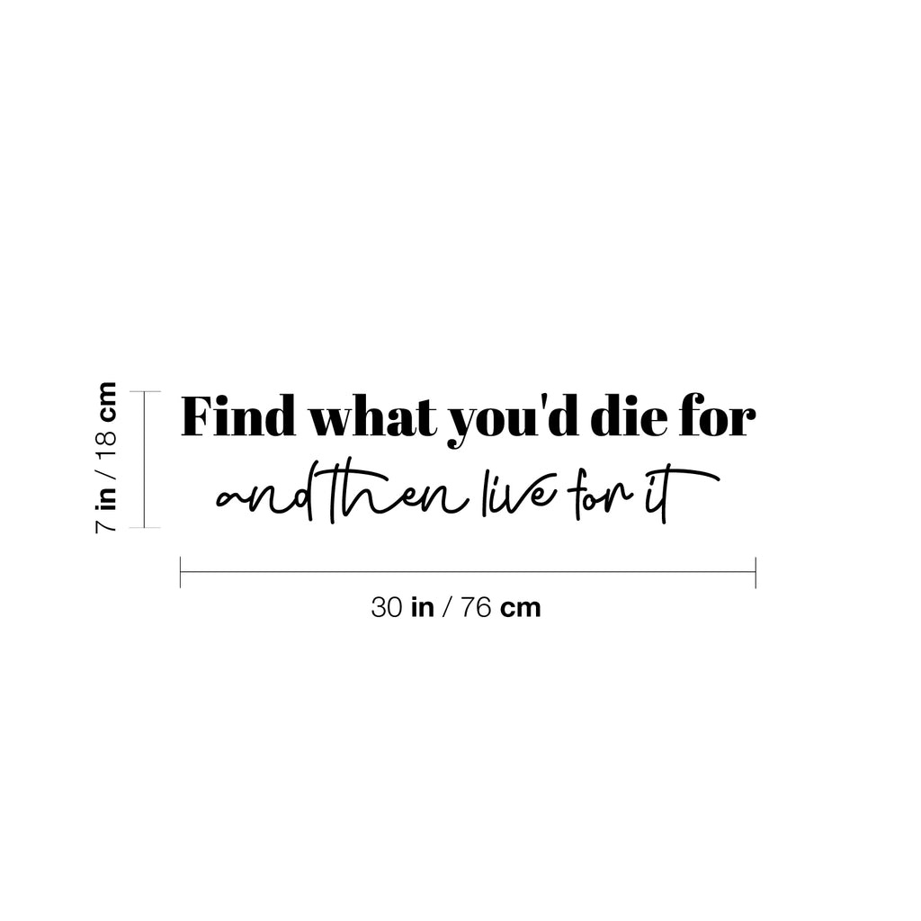 This awesome positive decal quote "Find What You'd Die For And Then Live For It"; is the perfect touch for your fitness center or home. Use it for your office; living room; storefront or anywhere you want to bring some extra positive decoration. It's a vinyl sticker that is easy to put on any smooth and dry surface. Our modern designs don't just brighten up the room; but brighten up the day. Using top of the line vinyl across all of our production allows us to be the leaders in quality and design.