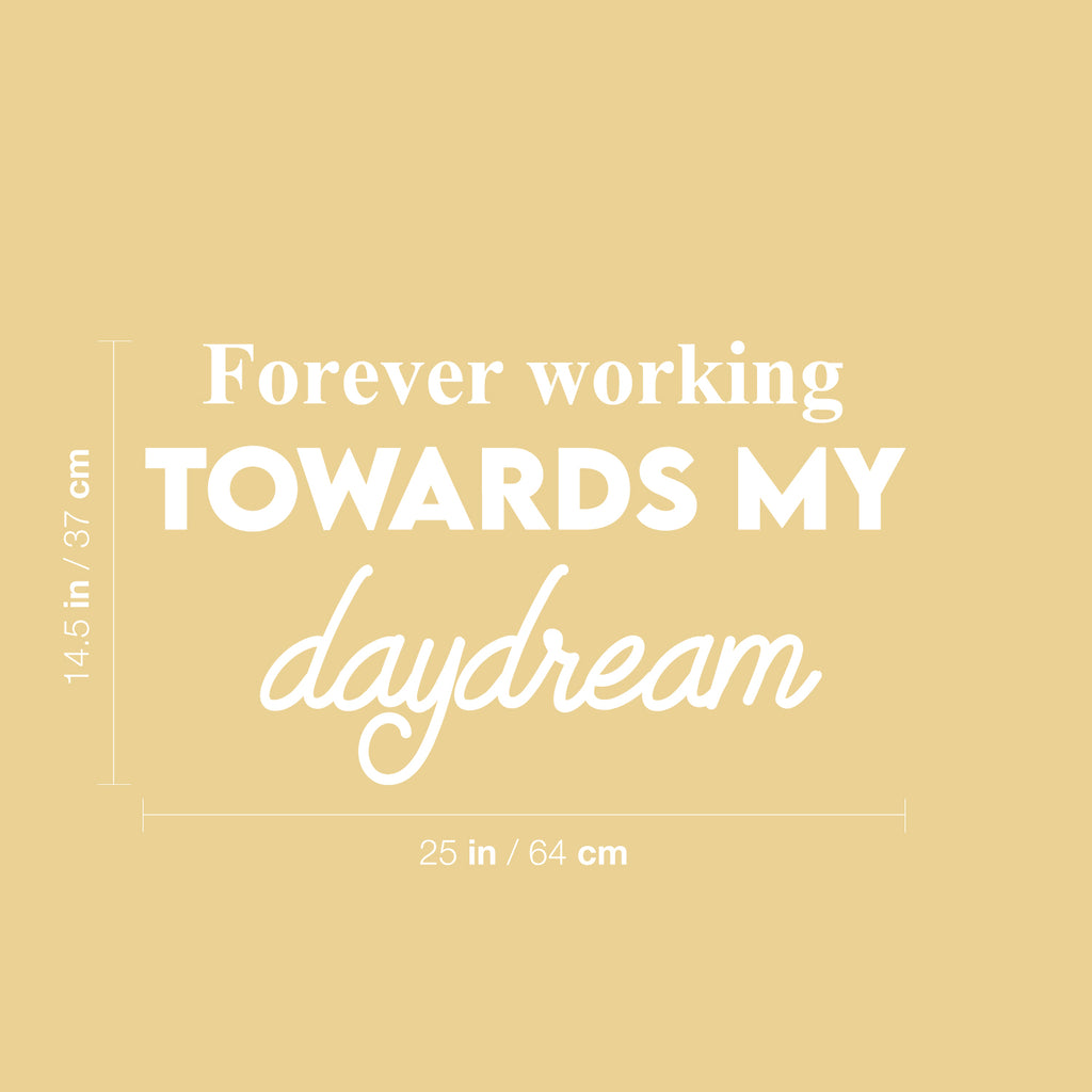 This awesome cute decal quote "Forever Working Towards My Daydream"; is the perfect touch for your home. Use it for your living room; playroom; kids room or anywhere you want to bring some extra cute decoration. It's a vinyl sticker that is easy to put on any smooth and dry surface. Our modern designs don't just brighten up the room; but brighten up the day. Using top of the line vinyl across all of our production allows us to be the leaders in quality and design.