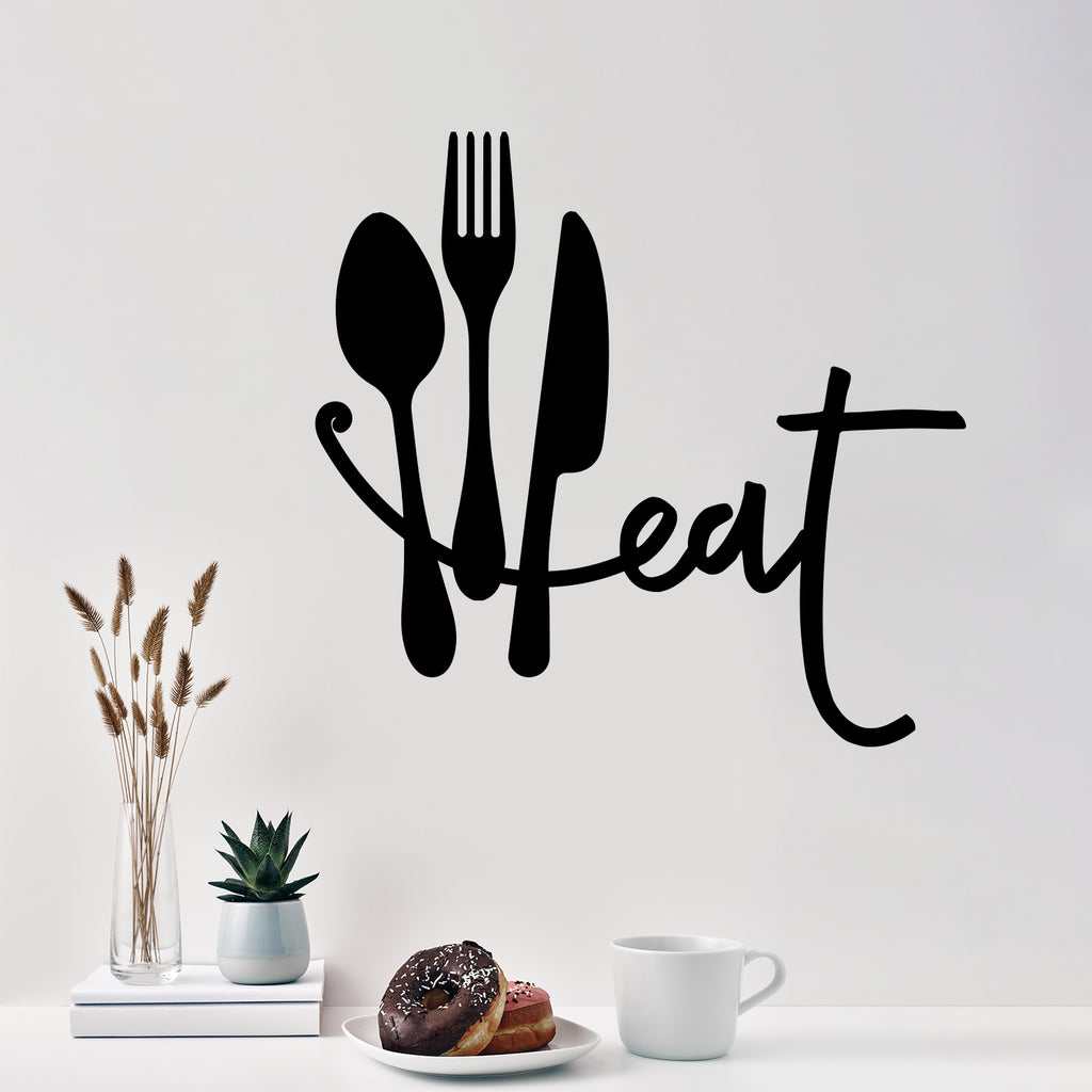 This awesome funny decal quote "Fork Knife Spoon"; is the perfect touch for your home or restaurant. Use it for your kitchen; coffee shop; bakehouse storefront or anywhere you want to bring some extra decoration. It's a vinyl sticker that is easy to put on any smooth and dry surface. Our modern designs don't just brighten up the room; but brighten up the day. Using top of the line vinyl across all of our production allows us to be the leaders in quality and design.