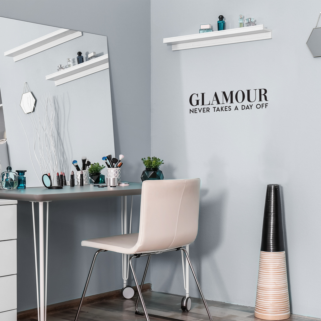 This awesome "Glamour Never Takes A Day Off" wall art decal is the perfect touch for your home or store. Use it for your bedroom; closet; bathroom or anywhere you want to bring some extra decoration. It's a vinyl sticker that is easy to put on almost any smooth and dry surface. Our modern designs don't just brighten up the room; but brighten up the day. Using top of the line vinyl across all of our production allows us to be the leaders in quality and design.